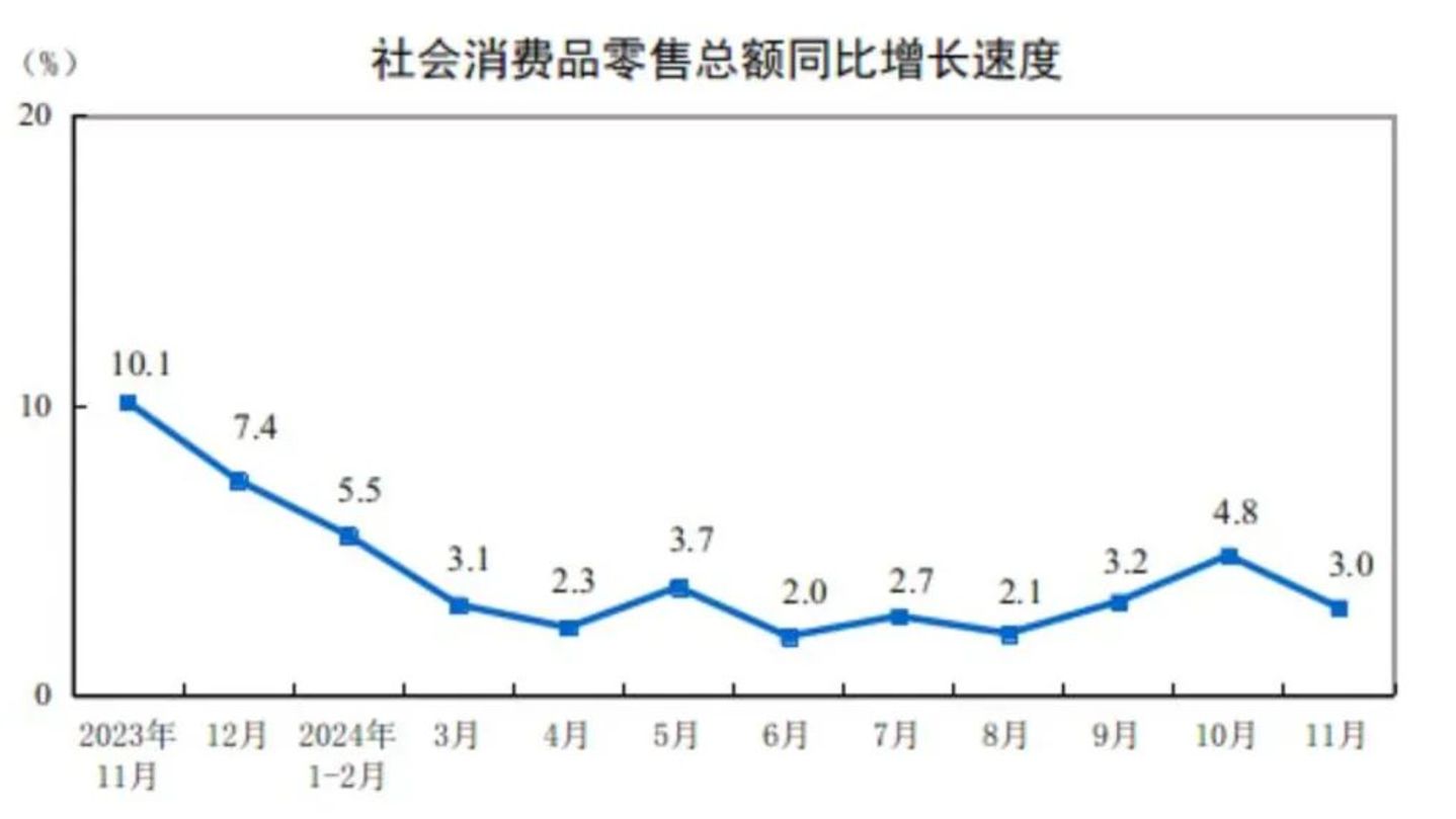 我们先看来自国家统计局的两个数据:2024年前三个季度,社会消费品零售总额同比增长3.3%,GDP同比增长为4.8%。
