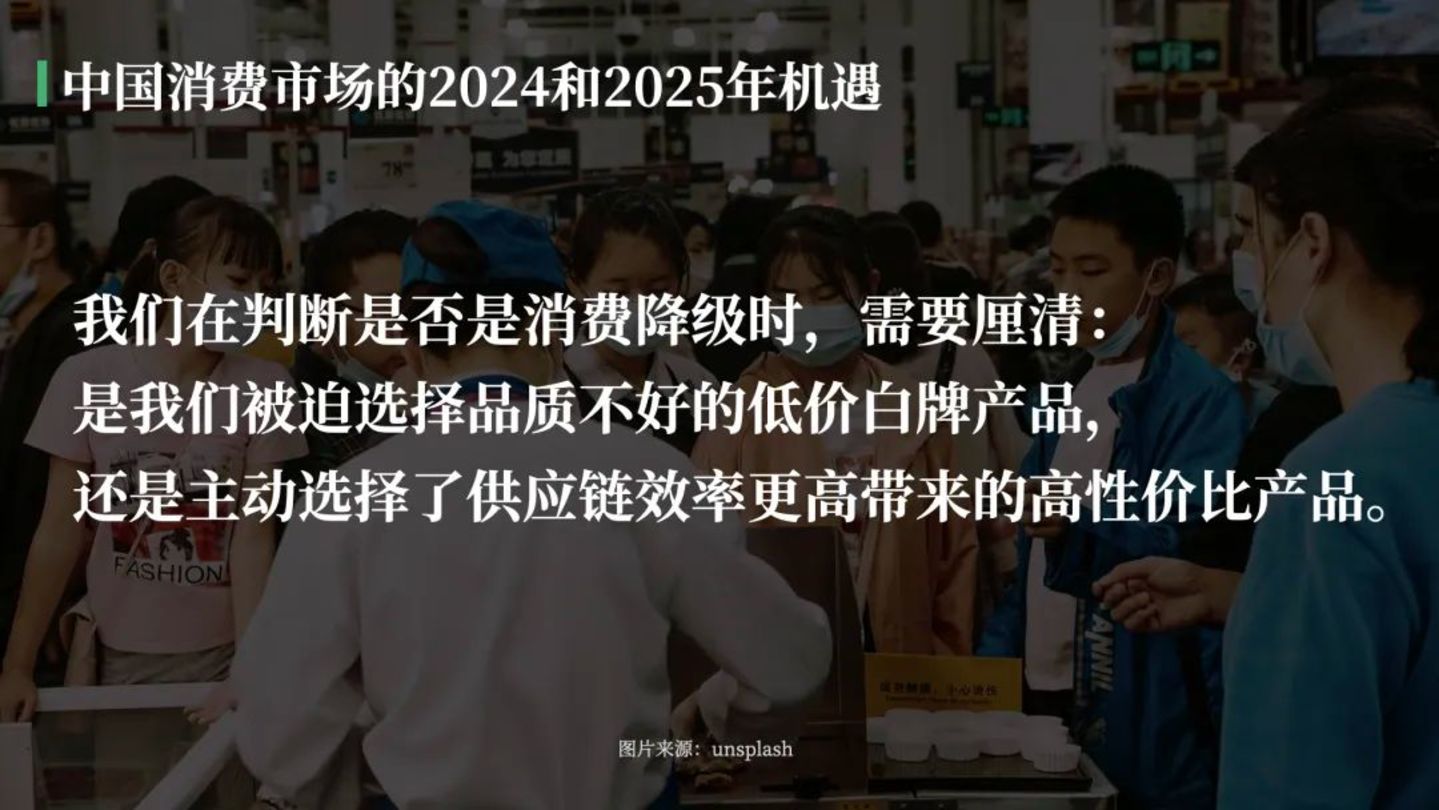 这需要具体而论,我们在判断是否是消费降级时,需要厘清:是我们被迫选择品质不好的低价白牌或无牌产品,还是主动选择了供应链效率更高带来的高性价比产品。