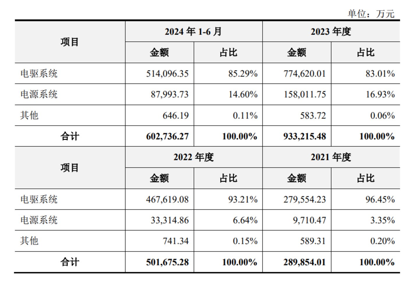 在收入构成上,电驱系统收入占据了绝大部分份额。招股书显示,2021年、2022年、2023年及2024年上半年,联合动力来自该业务的收入分别为27.96亿元、46.76亿元、77.46亿元及51.41亿元,收入占比分别为96.45%、93.21%、83.01%及85.29%。