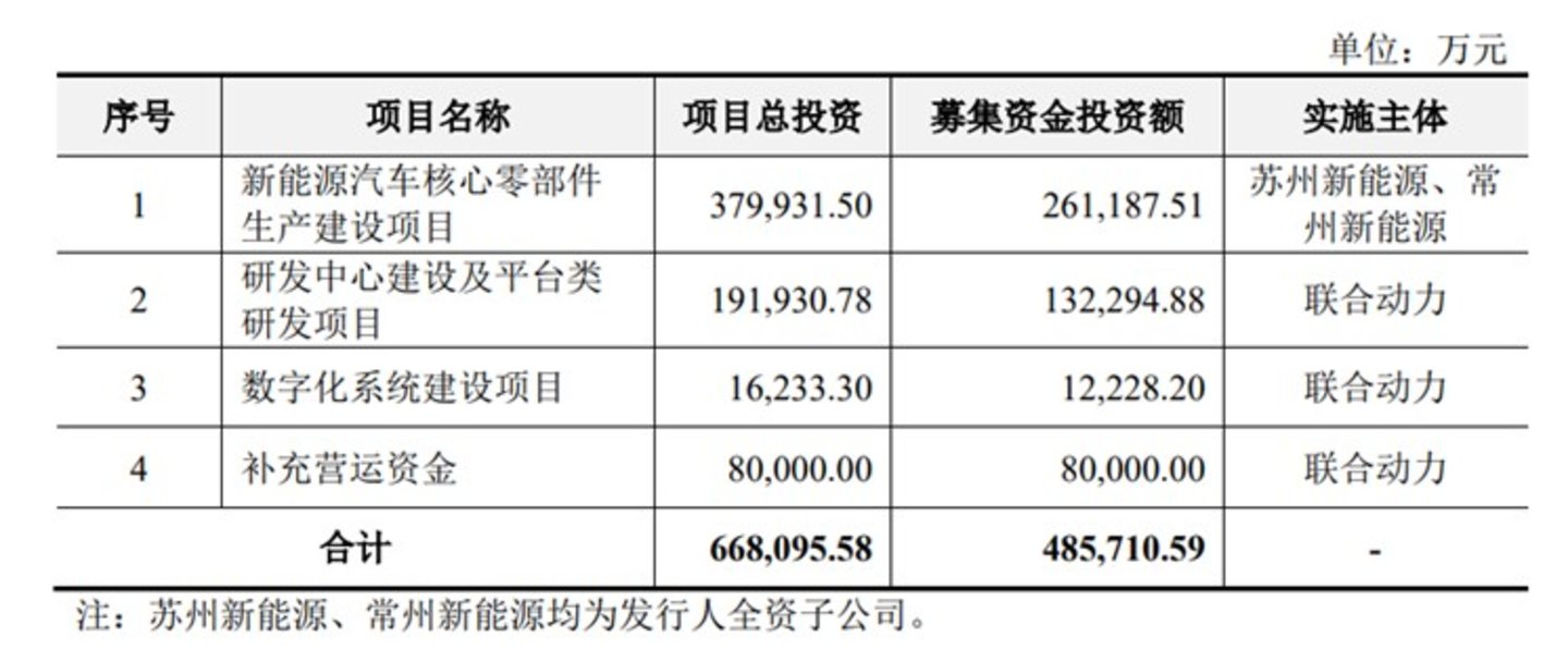 此次联合动力IPO的募集资金投资项目均围绕主营业务开展,主要投向新能源汽车核心零部件生产建设项目、研发中心建设及平台类研发项目、数字化系统建设项目和补充营运资金。