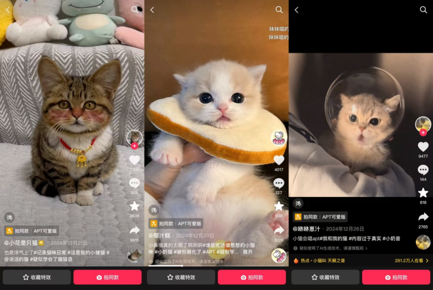 动物赛道是即梦首个落地的「想象的世界」,从去年10月起,一批基于动物AI特效的账号悄然起号。