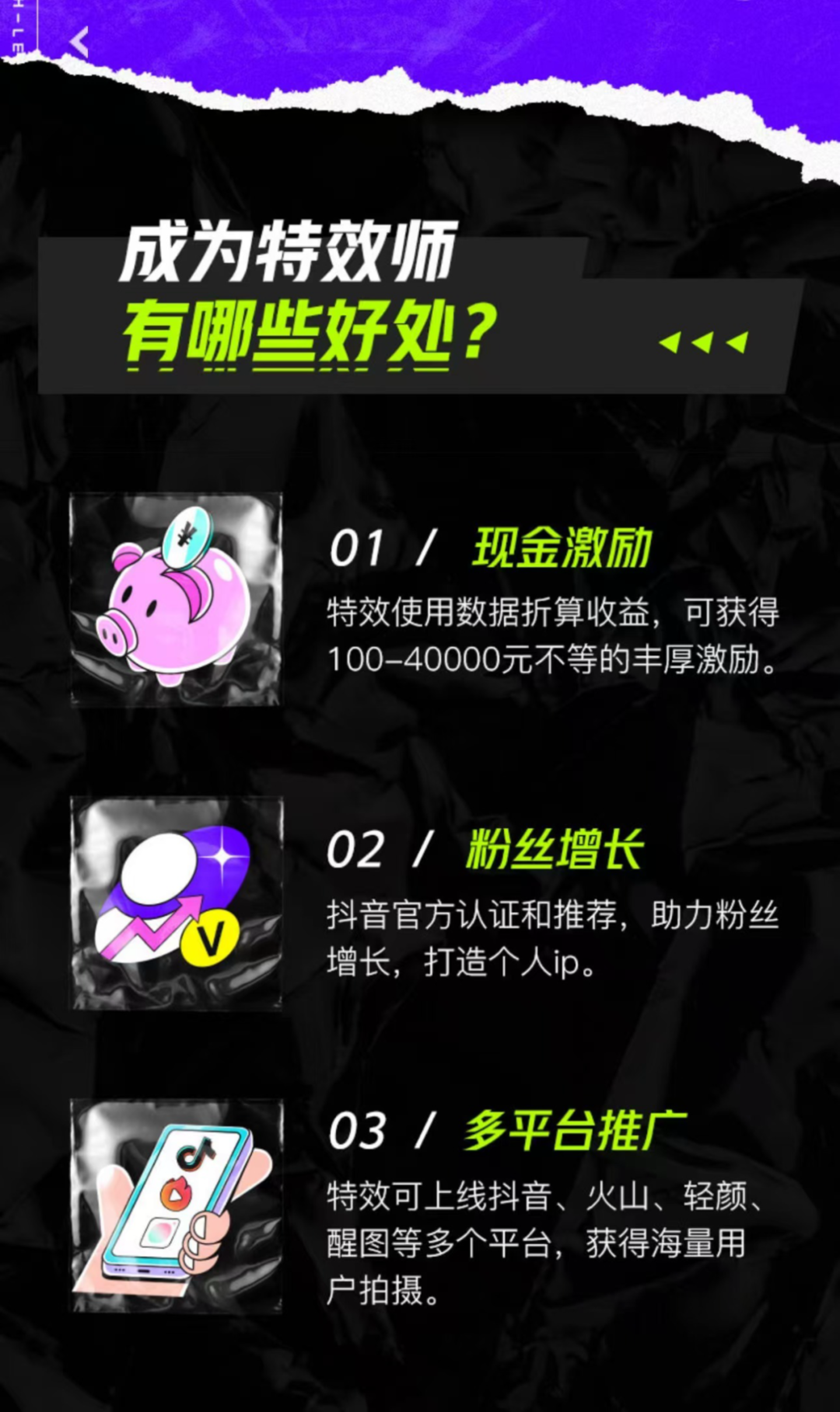 目前包括「强强白绘」等在内的抖音特效师的AI模板大都是在「像塑」平台创作,「像塑」会给予现金激励、粉丝增长以及多平台推广的扶持政策,成功打造出爆款特效的创作者,平台还会给特效师对接商单,以及一系列的营销活动,因此大多特效师都靠量产特效搏爆款。