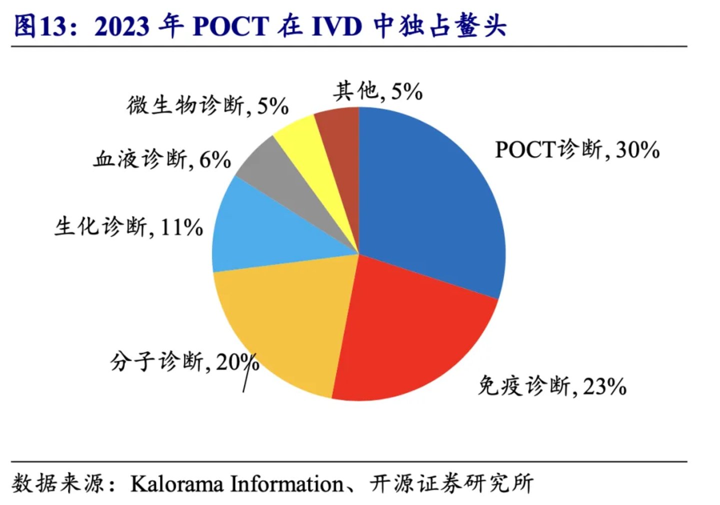 不过,就单POCT领域,万孚还大有可为。按照检验原理/方法分类,IVD市场可细分到POCT诊断、免疫诊断、分子诊断、生化诊断、血液诊断和微生物诊断等领域,截至2023年,POCT是整个IVD市场最大的细分领域,占据了30%的份额。