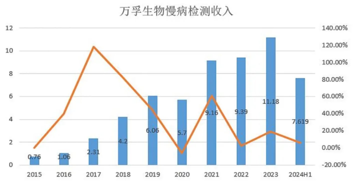 2024H1,万孚生物最大的营收来源慢病管理检测实现收入7.62亿元,同比增长 6.14%,虽然营收增速同整体增速比较一致(2024H1万孚整体营收增长5.82%),但毛利贡献巨大,上半年增长1.41pp,是带动公司利润增速跑赢营收增速的最核心原因之一。