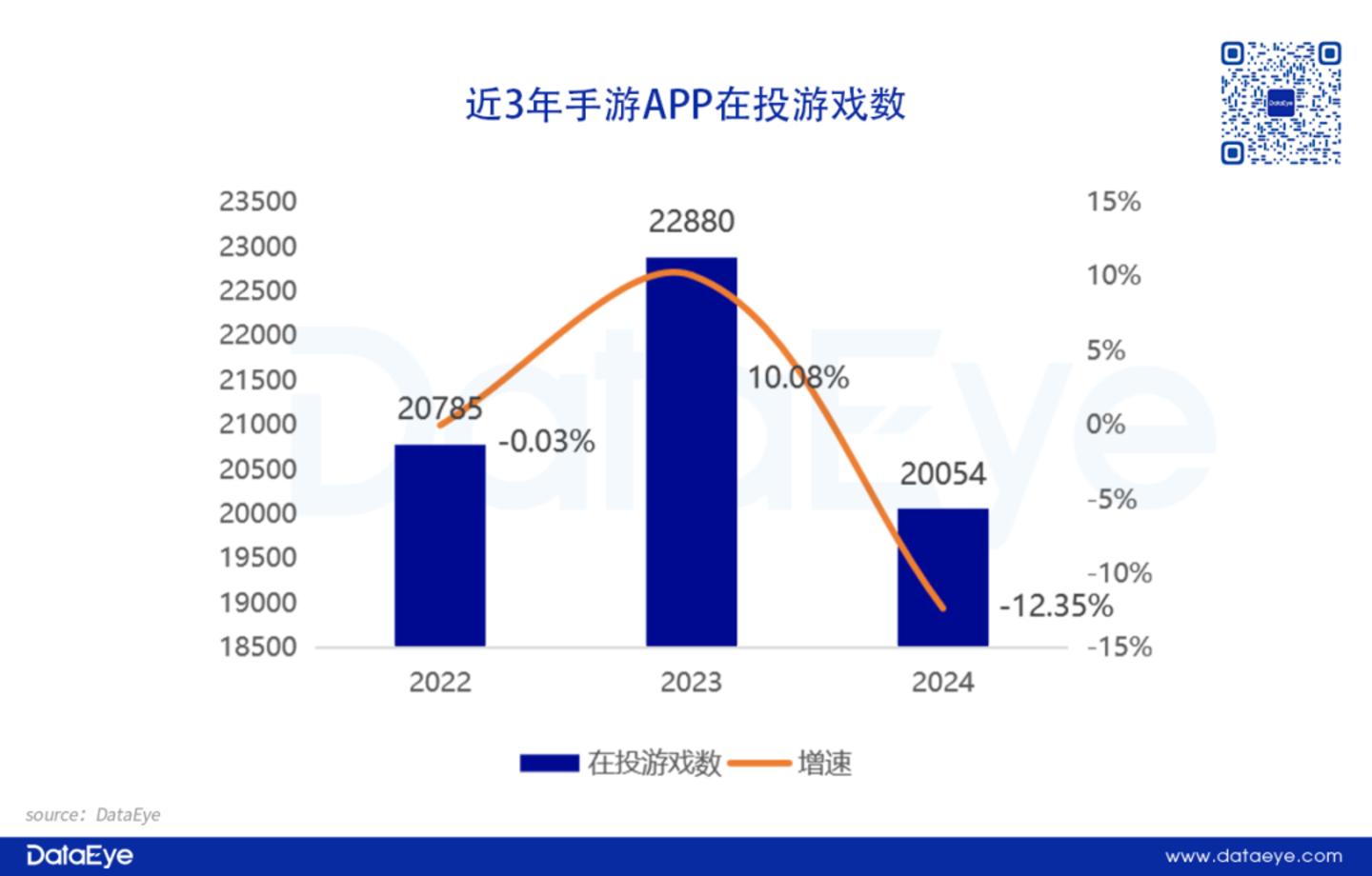 手游APP在投游戏数创3年最低。ADX数据显示,2024年手游APP在投数为20054款,同比下滑12.35%,在投游戏数为3年来最低。在投游戏数下滑明显,反映出手游APP竞争惨烈,不少厂商(特别是华南、北京厂商)转向小游戏或出海。