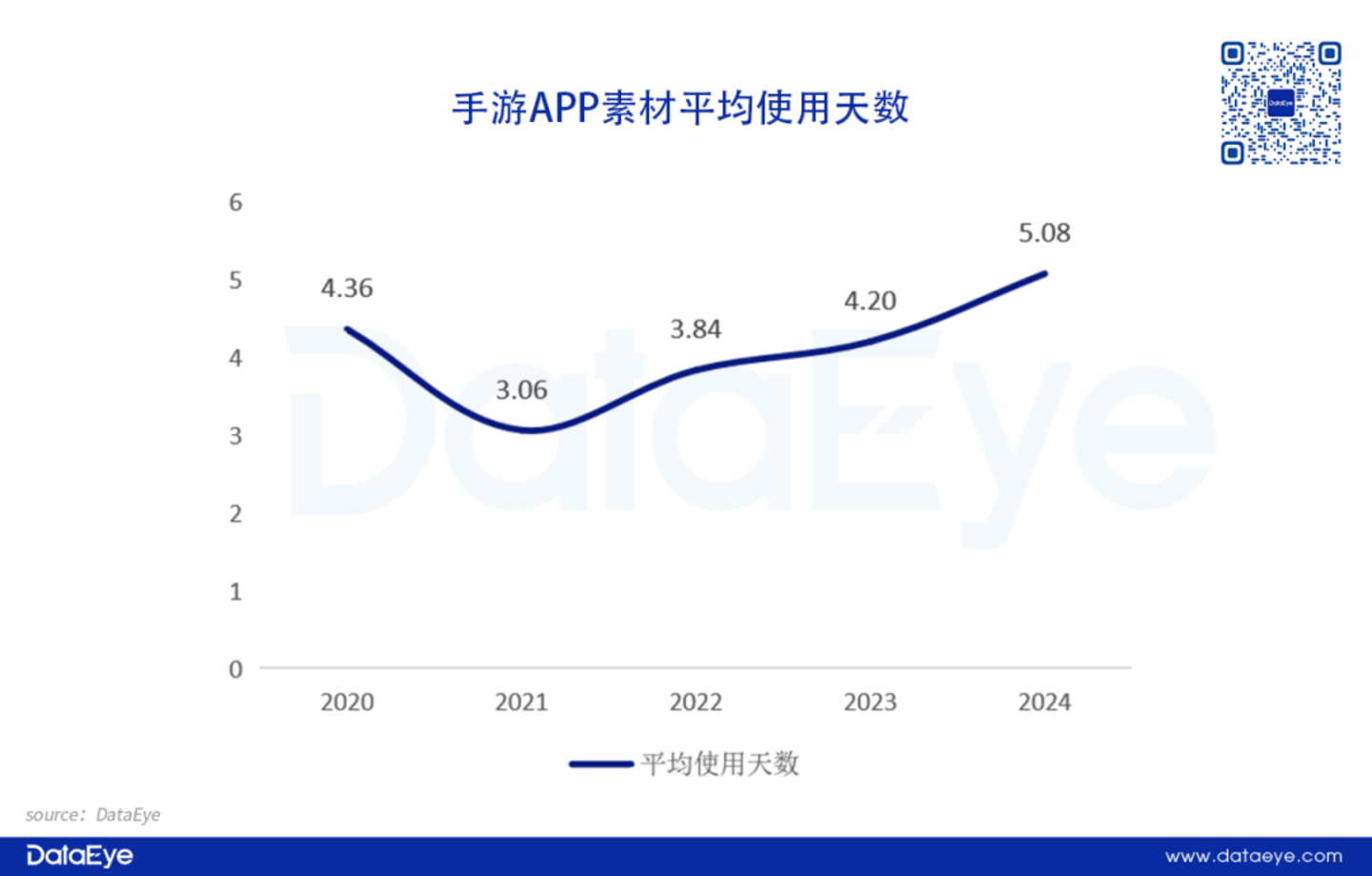2024年手游APP素材平均使用天数为5.08天,同比提升约0.9天。0-5天的素材占比下滑至80%,6-50天素材占比提升5%。