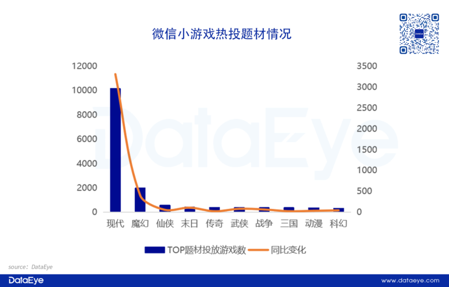 从热投题材来看,现代产品同比增多3000款,“小众”题材产品抢眼。微信小游戏的现代题材参投产品超过1万款,同比增长3000款,稳坐热投题材TOP1的位置,但多数为轻度休闲小游戏。