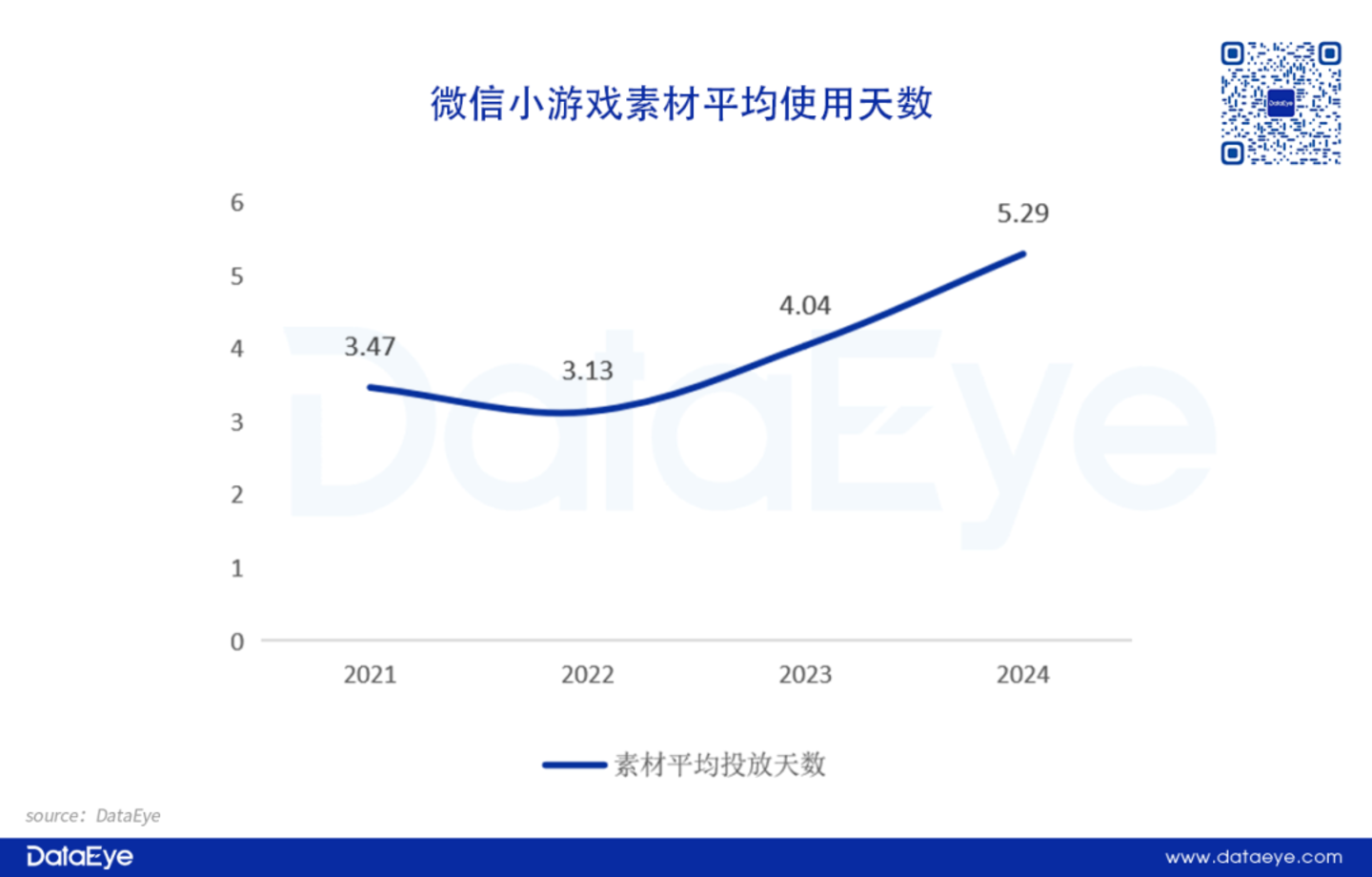 2024微信小游戏素材平均投放天数为5.2天,同比增长明显。反映出小游戏行业逐渐进入精细化运营阶段,产品生命周期也有所增长。