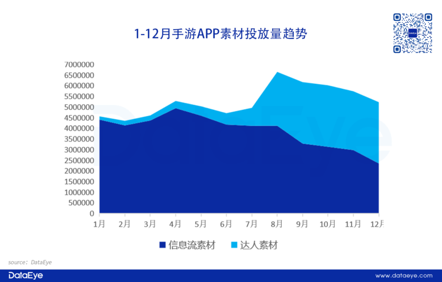 素材投放量在上半年就出现腰斩,7月投放量不足1月投放素材量的1/2。随后略有回升,但难回巅峰。