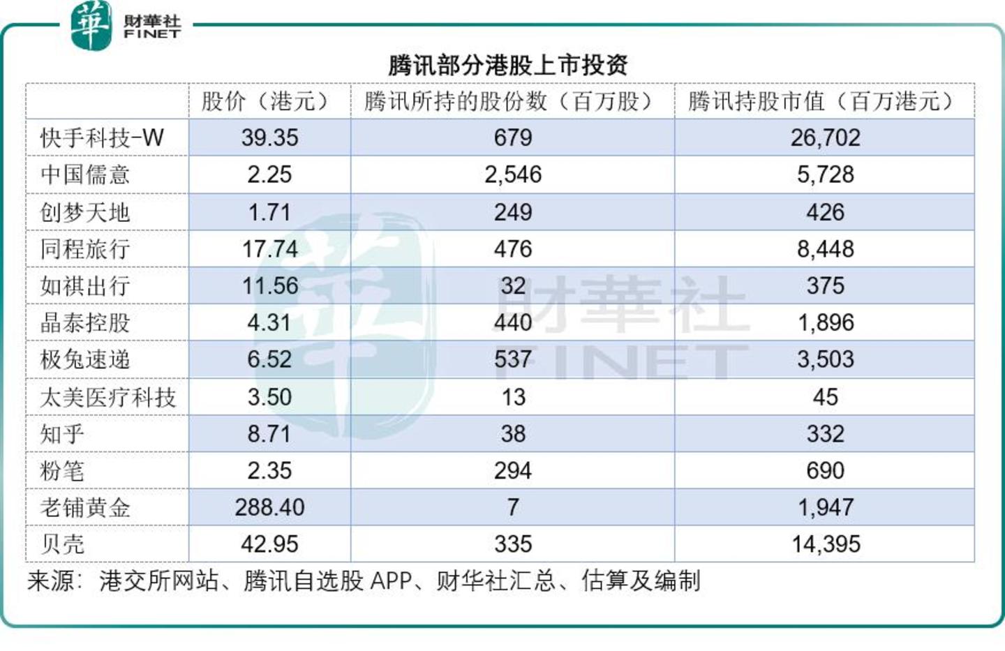 从港交所权益披露的数据来看,腾讯还持有中国儒意(00136.HK)(市值322.63亿港元)的17.75%权益(H股权益,下同)、创梦天地(01119.HK)(市值28.71亿港元)的14.74%权益、同程旅行(00780.HK)(市值412.88亿港元)的20.98%权益、如祺出行(09680.HK)(市值23.60亿港元)的15.87%权益、快手-W(01024.HK)(市值1,699.93亿港元)的19.02%权益、晶泰控股(02228.HK)(市值147.12亿港元)的12.91%权益,极兔速递(01519.HK)(市值578.28亿港元)的6.86%权益、太美医疗科技(02576.HK)(市值19.73亿港元)H股的6.47%、知乎(02390.HK)(市值22.82亿港元)H股的15.44%、粉笔(02469.HK)(市值52.40亿港元)的13.11%权益、老铺黄金(06181.HK)(市值485.57亿港元)H股的7.38%、贝壳(02423.HK)(市值1,504.94亿港元)H股的9.63%。