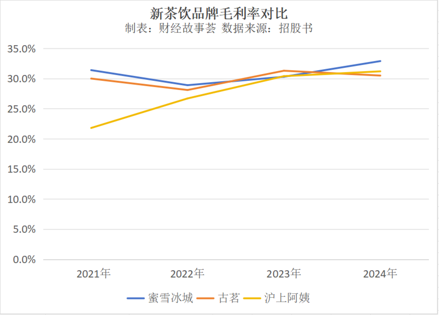 不过,整体来看,蜜雪冰城的毛利率与其他玩家并无明显差距。报告期内,蜜雪冰城的毛利率分别为31.4%、28.9%、30.3%及32.9%,略有波动,近三年有所回暖。古茗分别为30.0%、28.1%、31.3%及30.5%,整体略有下降。沪上阿姨的数据截至2024年前6个月,期间其毛利率一直在增长,从“差生”追赶至行业平均水平,分别为21.8%、26.7%、30.4%及31.2%。