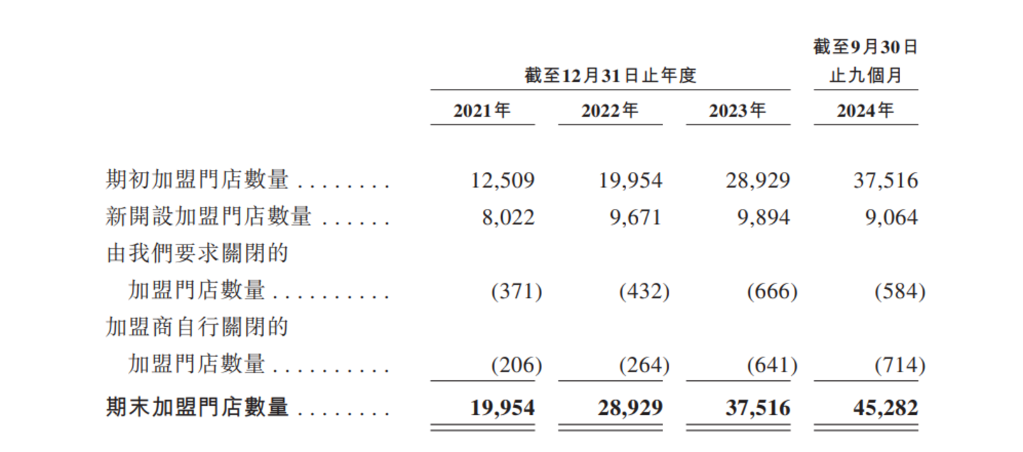 招股书显示,2021年至2024年前9个月,蜜雪冰城关闭的加盟门店数量分别为577家、696家、1307家及1298家。其中,加盟商自行关闭的加盟店数量持续增加,分别为206家、264家、641家、714家。虽然数量在增加,但关闭门店在其整体门店中的占比并不高。