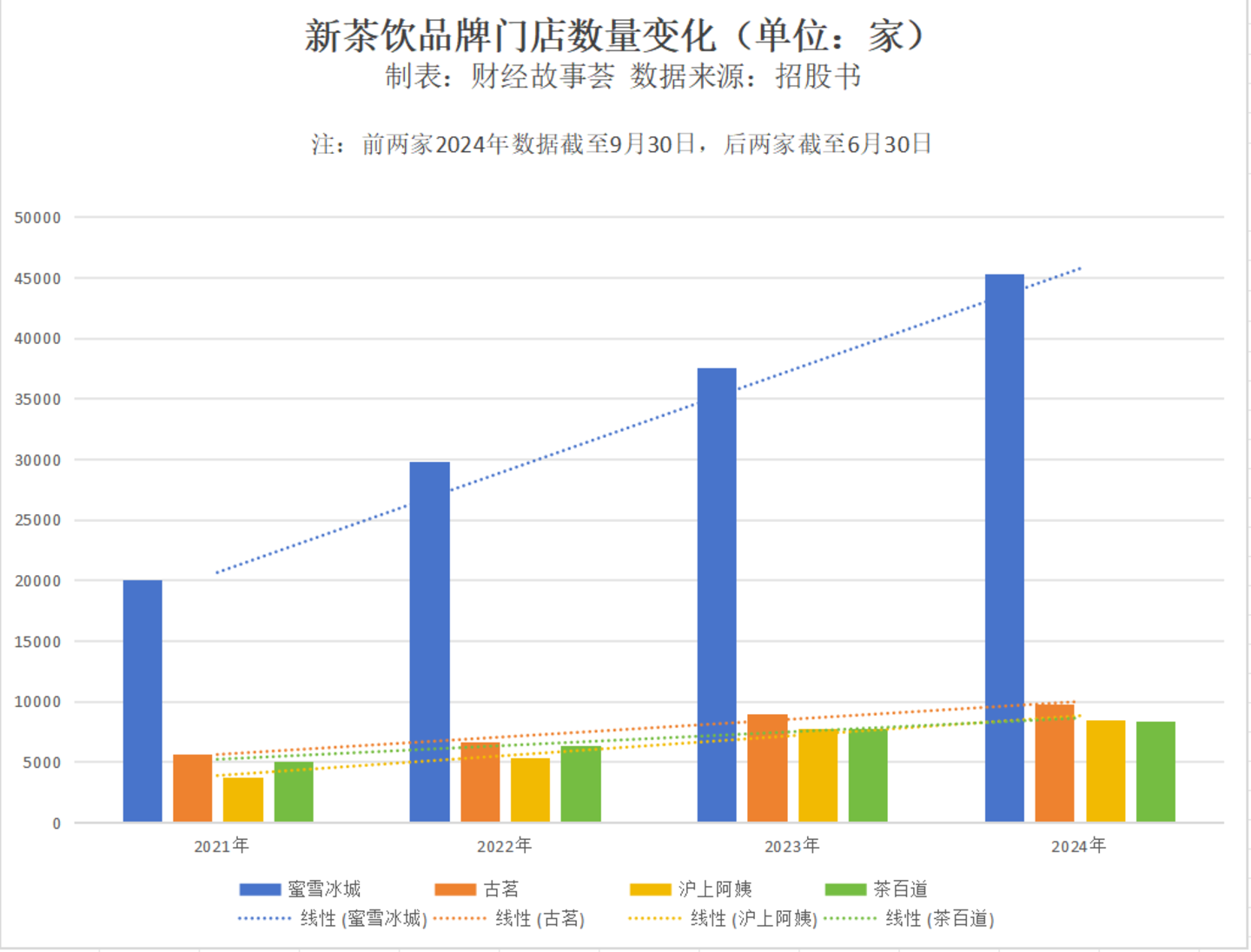 成立前10年,蜜雪冰城只开了1家店,从1000家到10000家,蜜雪冰城花了6年时间,再从万家门店增长到20000家,仅仅耗时两年。2024年,蜜雪冰城首次在港股申请IPO时,门店规模是36153家。今年元旦,蜜雪冰城给出的数据变成了45282家,而在同一赛道上,截至2024年前9个月,排在第二的古茗门店也没到万家。