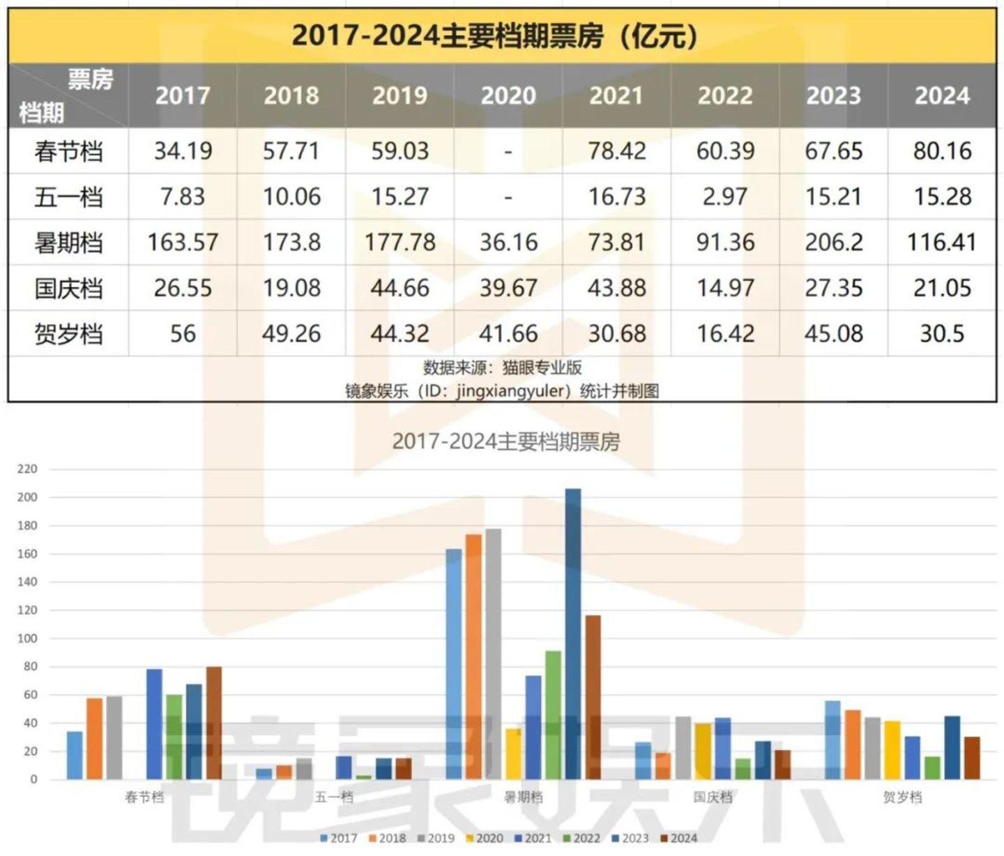 2024年,大盘整体回落与热门档期产出降低高度相关,几乎每个档期都出现了票房回落的现象,尤其是票仓承载力最大的暑期档,直接从去年的206.2亿元滑落至116.41亿元,近乎腰斩。