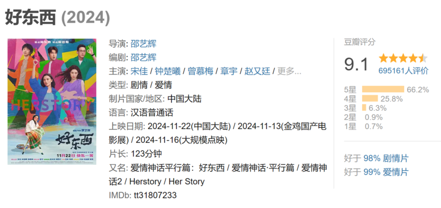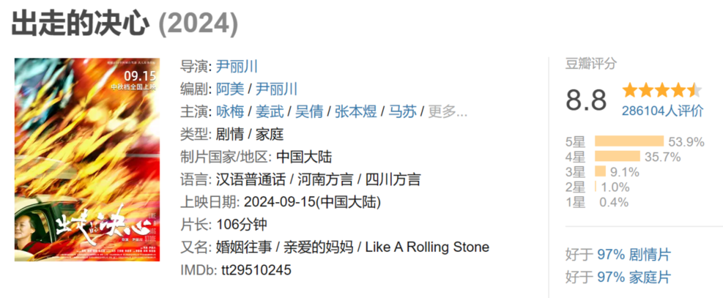 另一个亮点,2024年,女性电影频频带给市场惊喜,从年初贾玲执导的《热辣滚烫》揽下34亿票房,到后来上映的《出走的决心》《好东西》分别拿下豆瓣8.8、9.1的高分,女性电影整体呈现出口碑票房双收的趋势。