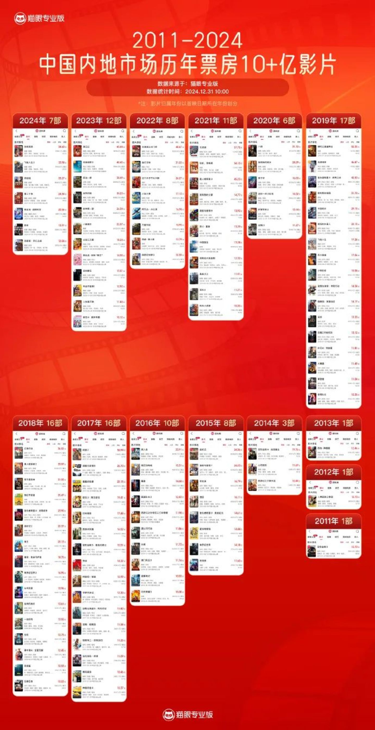 在这之中,支撑档期的头部影片出现了明显的缺位现象。据猫眼专业版统计,2017年至2019年,国内单片票房在10亿以上的电影都在16部左右,在电影市场恢复期的2021年和2023年,10亿+影片也在10部以上,而2024年则只有7部。