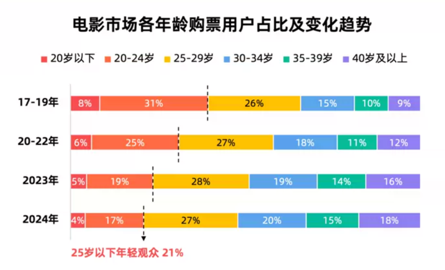 伴随着这些变化,电影市场的消费人群也开始发生变化,2024年,影院消费人群年龄结构出现失衡的趋向。