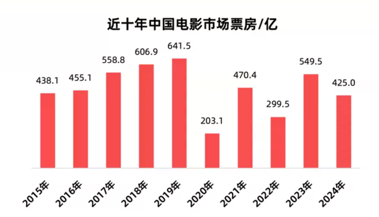 2024年是电影市场全面回落的一年,据国家电影局统计,2024年,全国电影总票房共计425.02亿元,抛开疫情期间的影响,这一数据甚至低于2015年的438.1亿元,“倒退十年”成为被频繁提及的关键词,高歌猛进的电影市场陷入了新的低谷期。