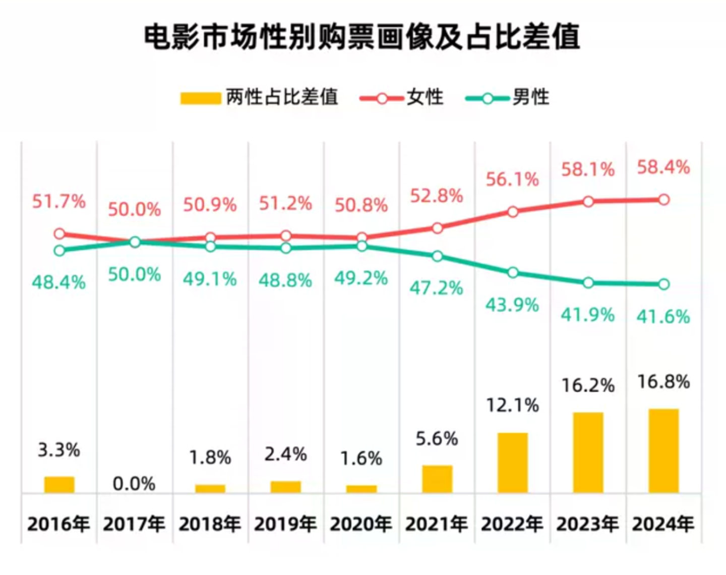 受此影响,电影市场的女性观影群体有持续扩大的趋势。灯塔专业版数据显示,2024年,女性观众占比进一步提升至58.4%,在女性题材、粉丝向的电影作品中,女性观众占比明显更多。基于此,之后的电影创作大概率会出现更多偏向女性观众的作品,女性电影甚至有望成为下一个潜在爆点。