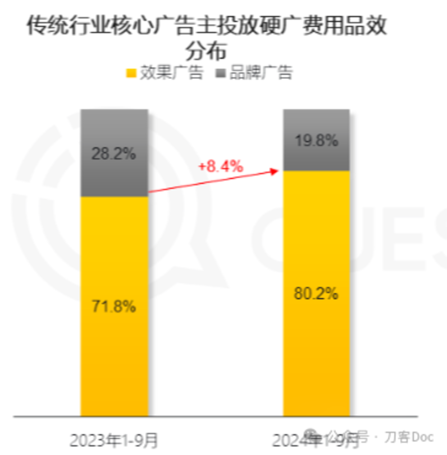QuestMobile数据显示,2024年1-9月传统行业硬广投放费用规模低于100万的品牌数量占比,较去年同期增加约10个百分点。