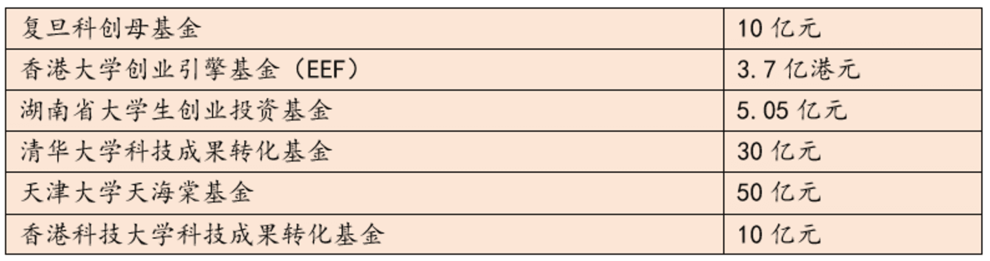 其次,除了所熟知的市场化机构、国资、政府基金、产业化资本外,高校基金正成为这个市场不可忽视的玩家,清华大学、复旦大学、香港大学、天津大学等在科创母基金、天使基金以及科技成果转化等方面都十分积极,先后设立新基金。