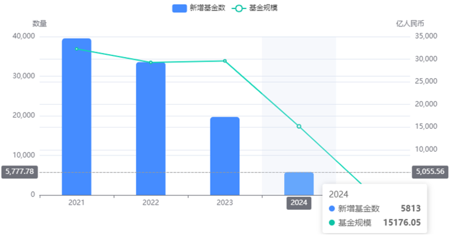 当前,中国私募股权机构募资难度越来越大,新基金的设立正变得越来越谨慎。融中数据显示,2024年,中国私募市场新增基金募集数量5813只,基金规模15176.05亿元,无论是基金规模还是数量都处于近年来最低水平。