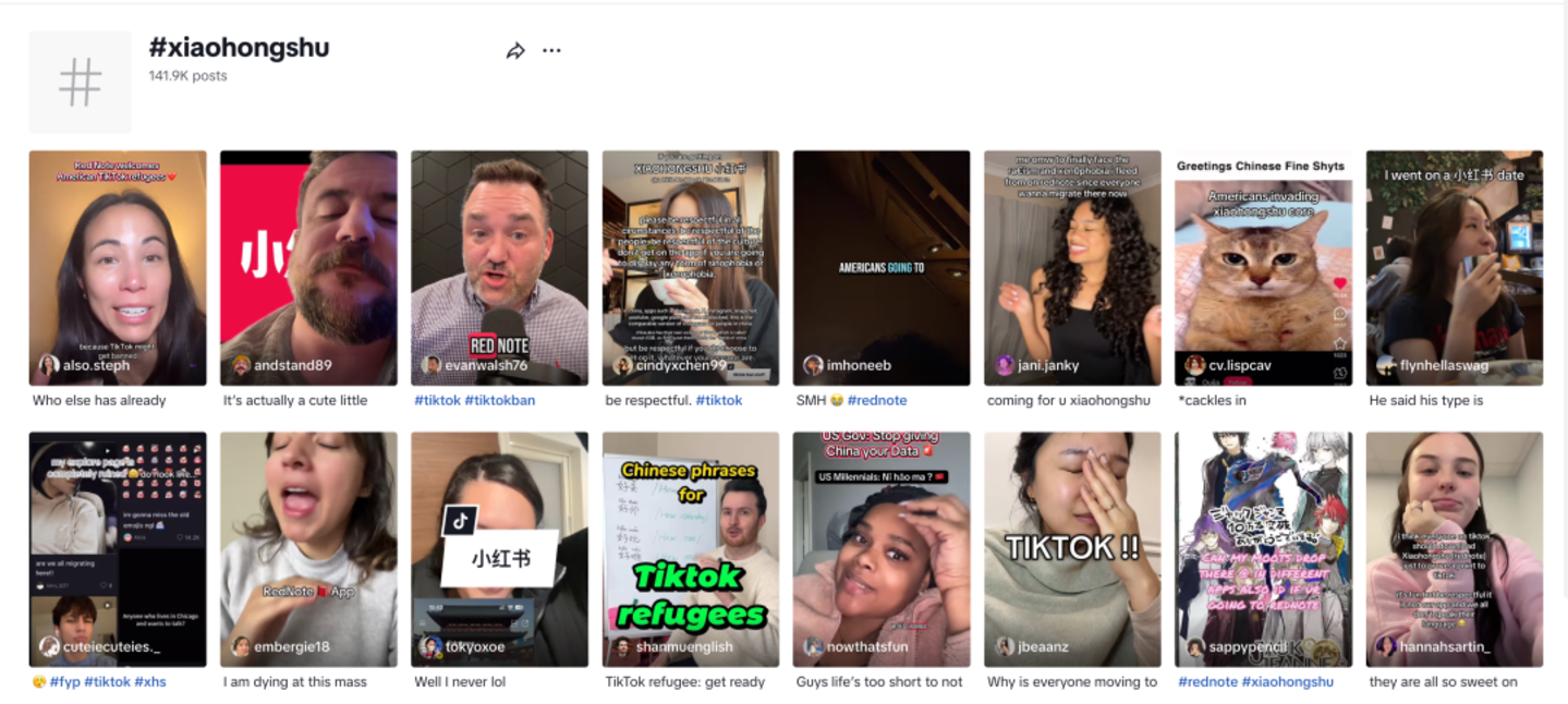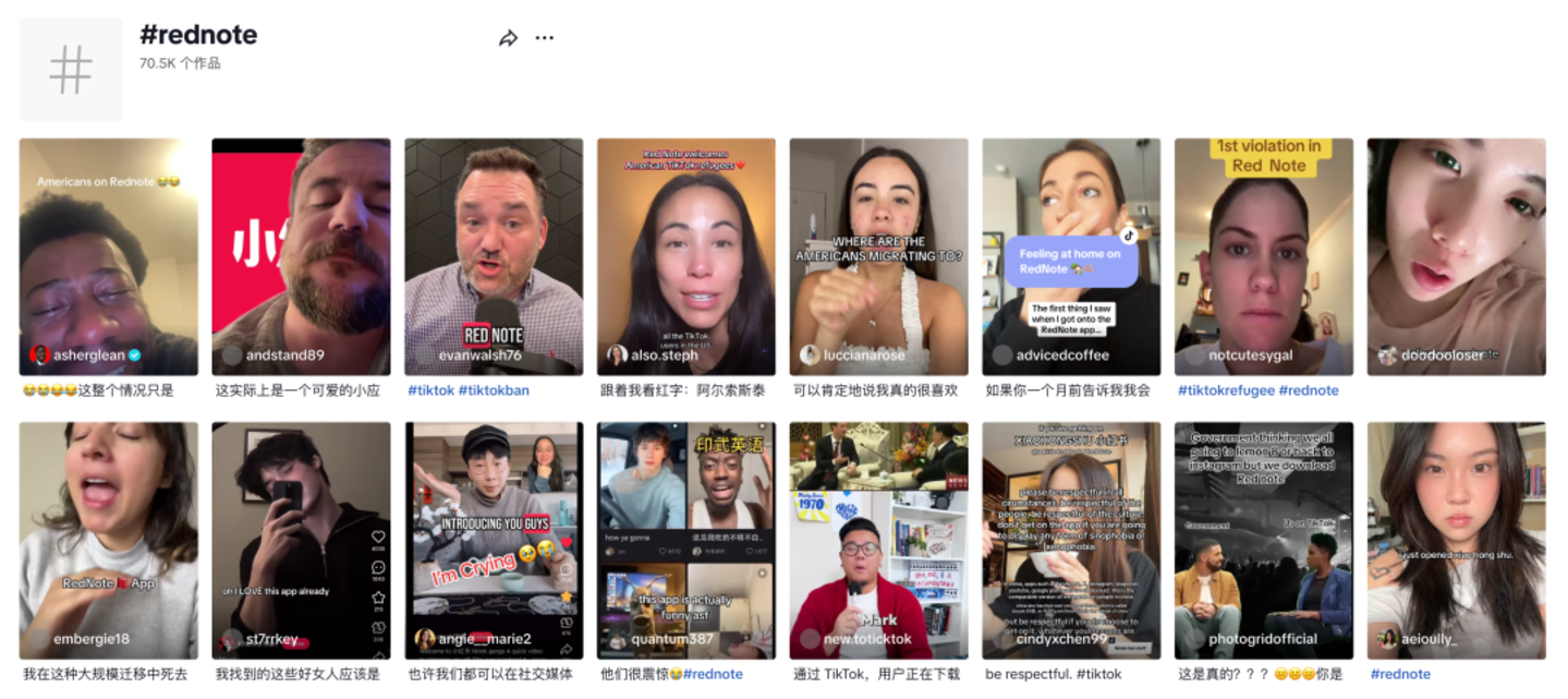 这让小红书成为了当下中美互联网中少有的没有地理障碍的社交应用,美国用户和中国用户看到的是同一个页面、同一个信息流。TikTok 难民们涌入小红书之后,面对的是一个与美国社交环境迥异的中文社区,两种不同语言文化初期的交流充满着新鲜感,继而不断引来更多海外用户加入,逐渐形成一种赛博潮流。