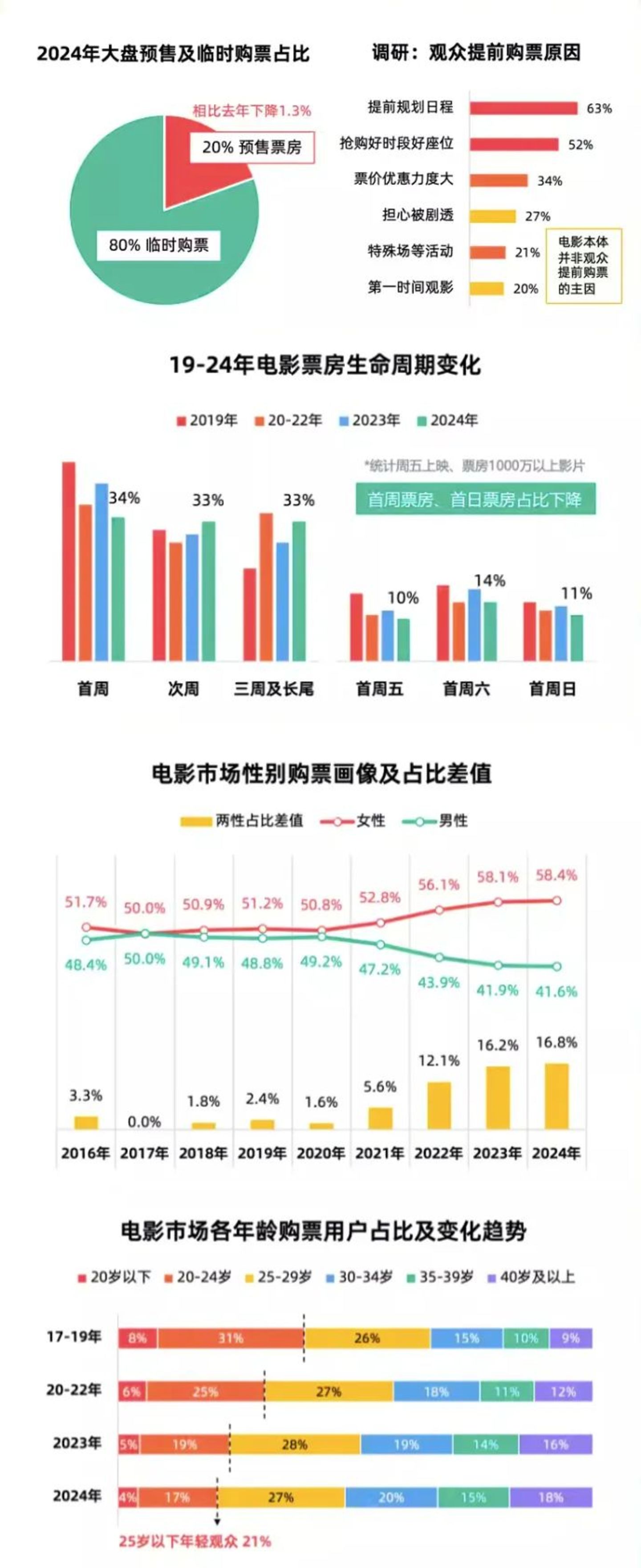 灯塔数据报告显示,2024年电影市场80%预售下降,大盘八成票房来自放映当日临场购票,首周票房份额落至34%,口碑噪声让观影更后置;与此同时,男性观众、年轻观众的比例进一步下降,女性观众比例58%,两性评价差异放大,年轻观众占比降至21%。