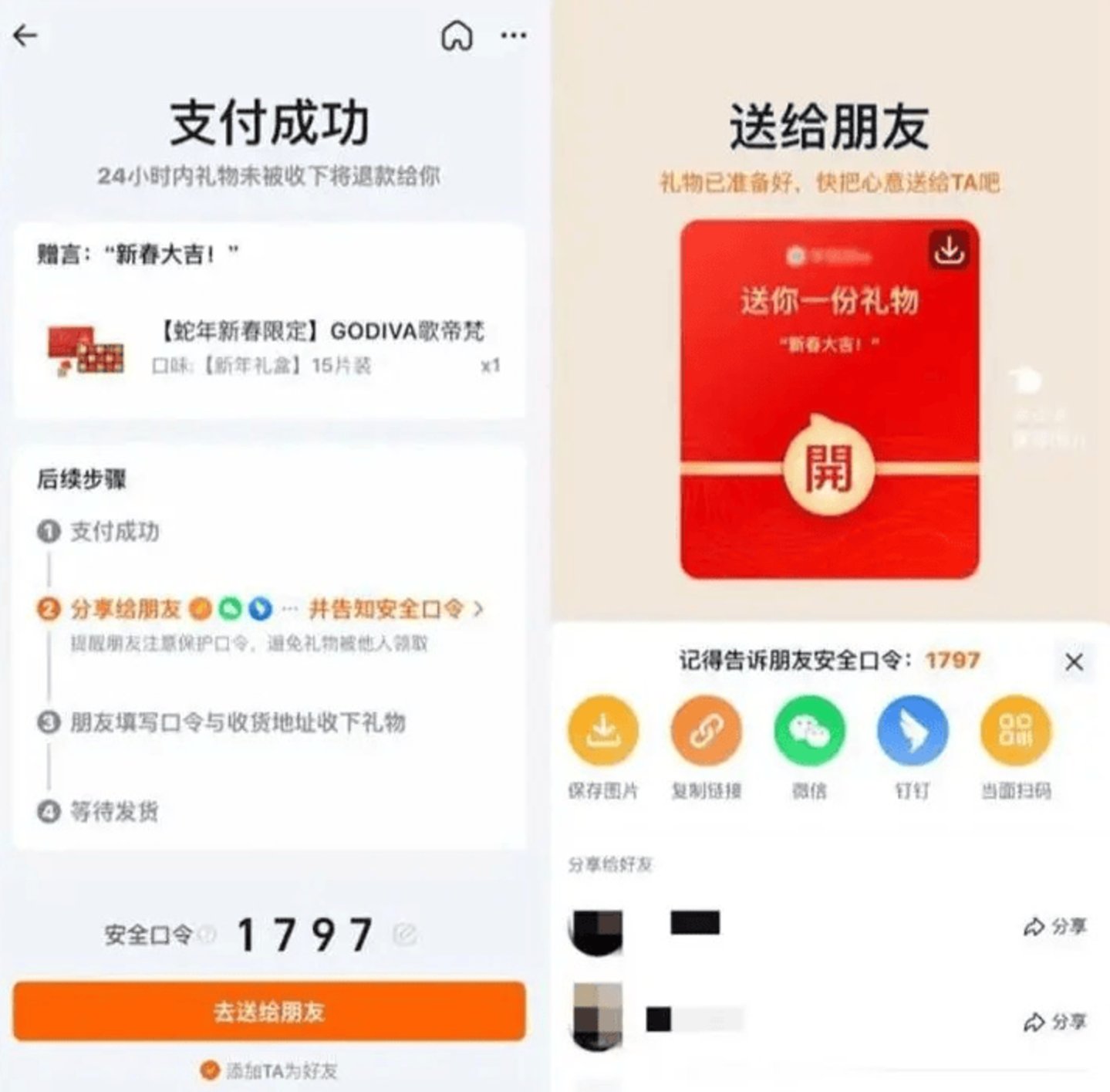 淘宝方面,购买成功后会生成一个安全口令,礼物接收者需要填写口令和地址才能收下礼物。由于阿里集团没有类似于微信的强社交应用,礼物发送的渠道就非常多,包括淘宝App内消息功能(可以在这里添加好友)、微信、钉钉或是当面扫码,略显繁琐。
