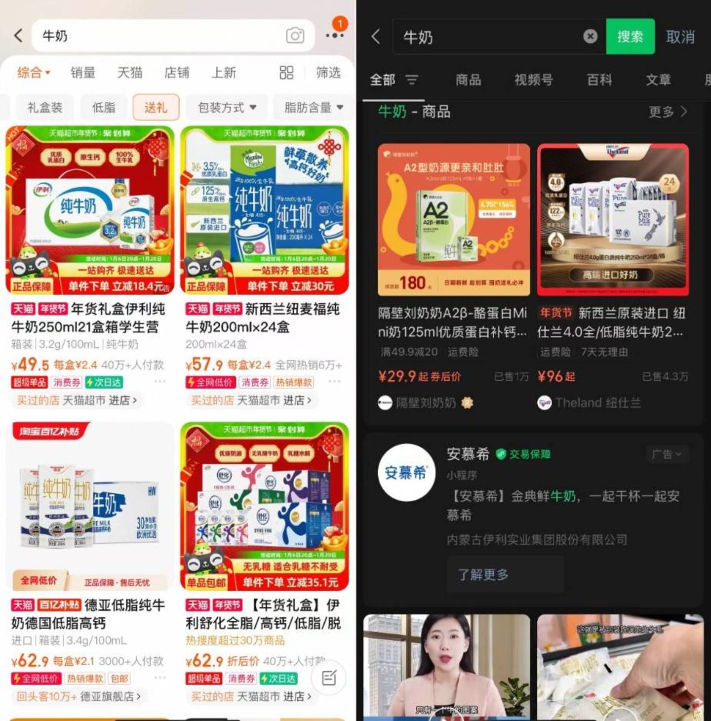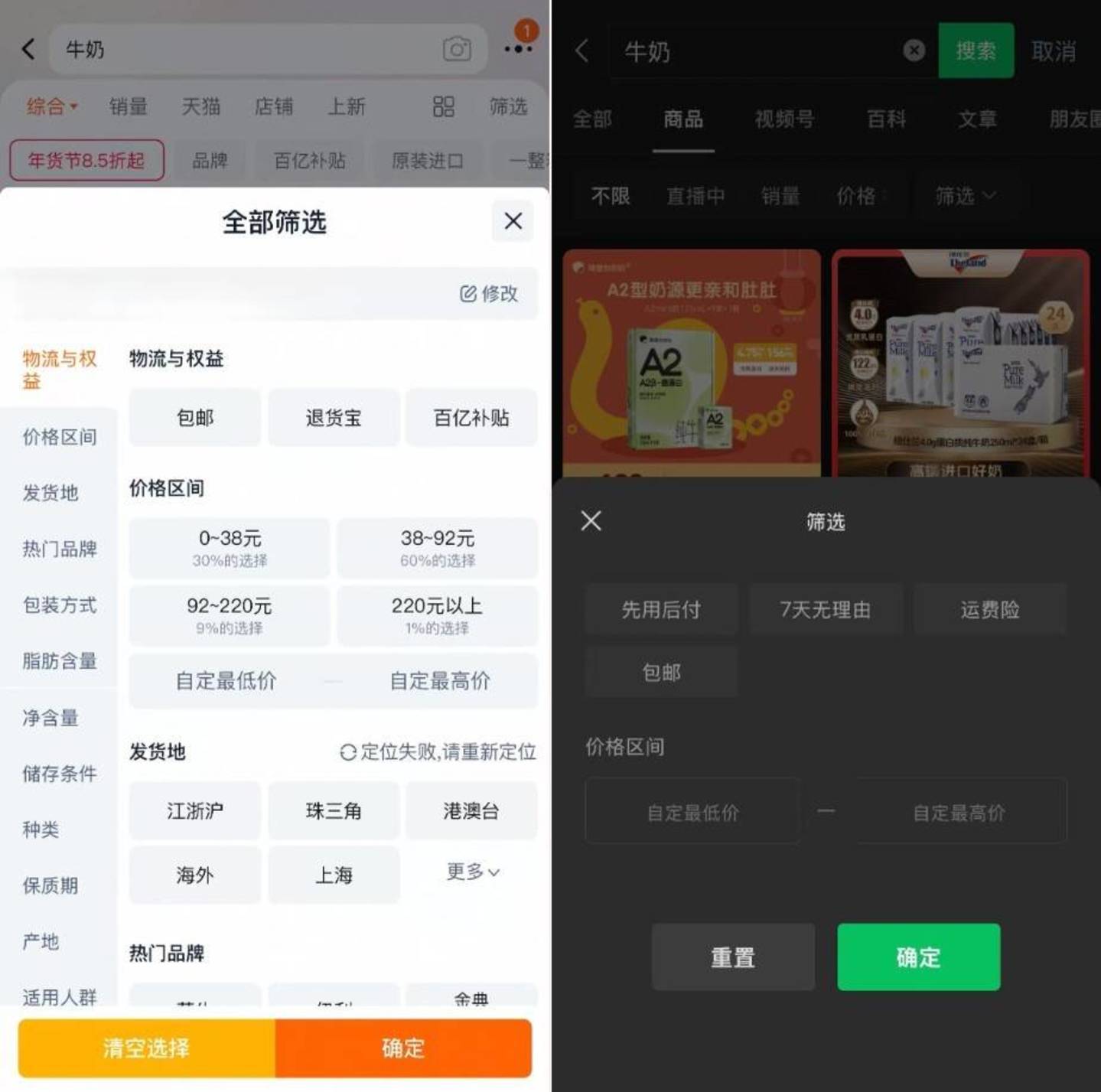 找到入口后,接下来就是挑选商品,这时比拼的就是货架功能。淘宝作为专业货架电商无疑更胜一筹,从价格范围、发货地、品牌以及具体产品的参数(如牛奶的脂肪含量)一应俱全。相对来说,微信小店仅提供了先用后付、包邮、价格区间等简单的选项,不够全面。