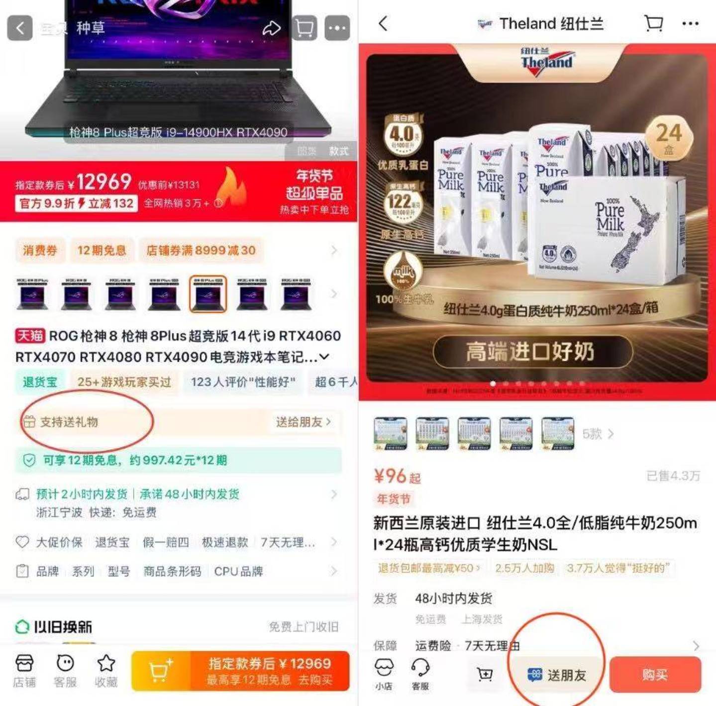 淘宝(左)和微信小店(右)送礼物商品页面