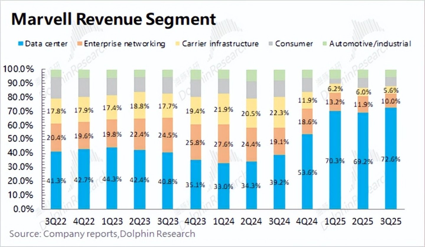相比来看,博通的收入体量更大,也将具有更高的市场份额。而Marvell的业务中数据中心相关收入占比更高,AI属性也更浓;
