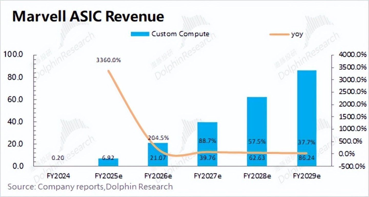 综合来看,海豚君预期Marvell的ASIC收入至2029财年有望成长至86亿美元,复合增速将达到88%,超过整体行业增速,相关市场份额也将提升至20%左右。