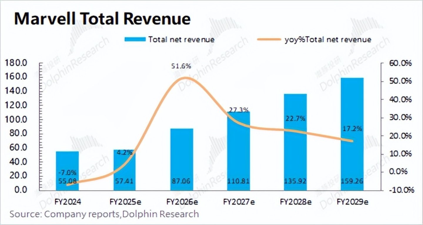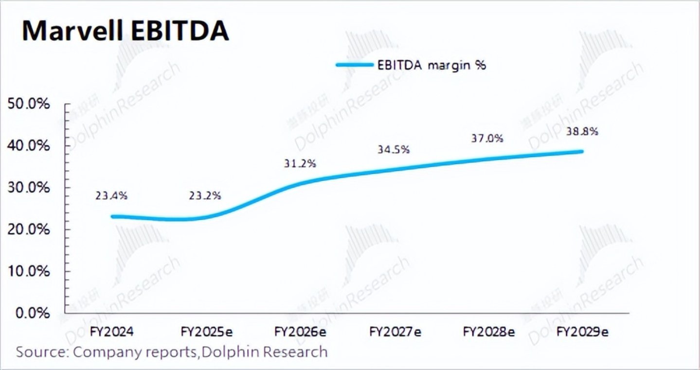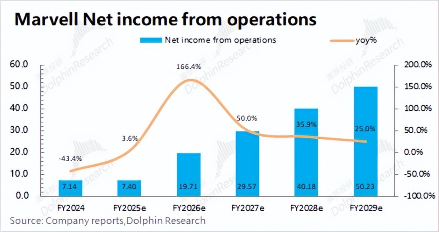 从而预期Marvell的经营面净利润在2028年(2029财年)有望增长至50亿美元,复合增速达到60%左右。