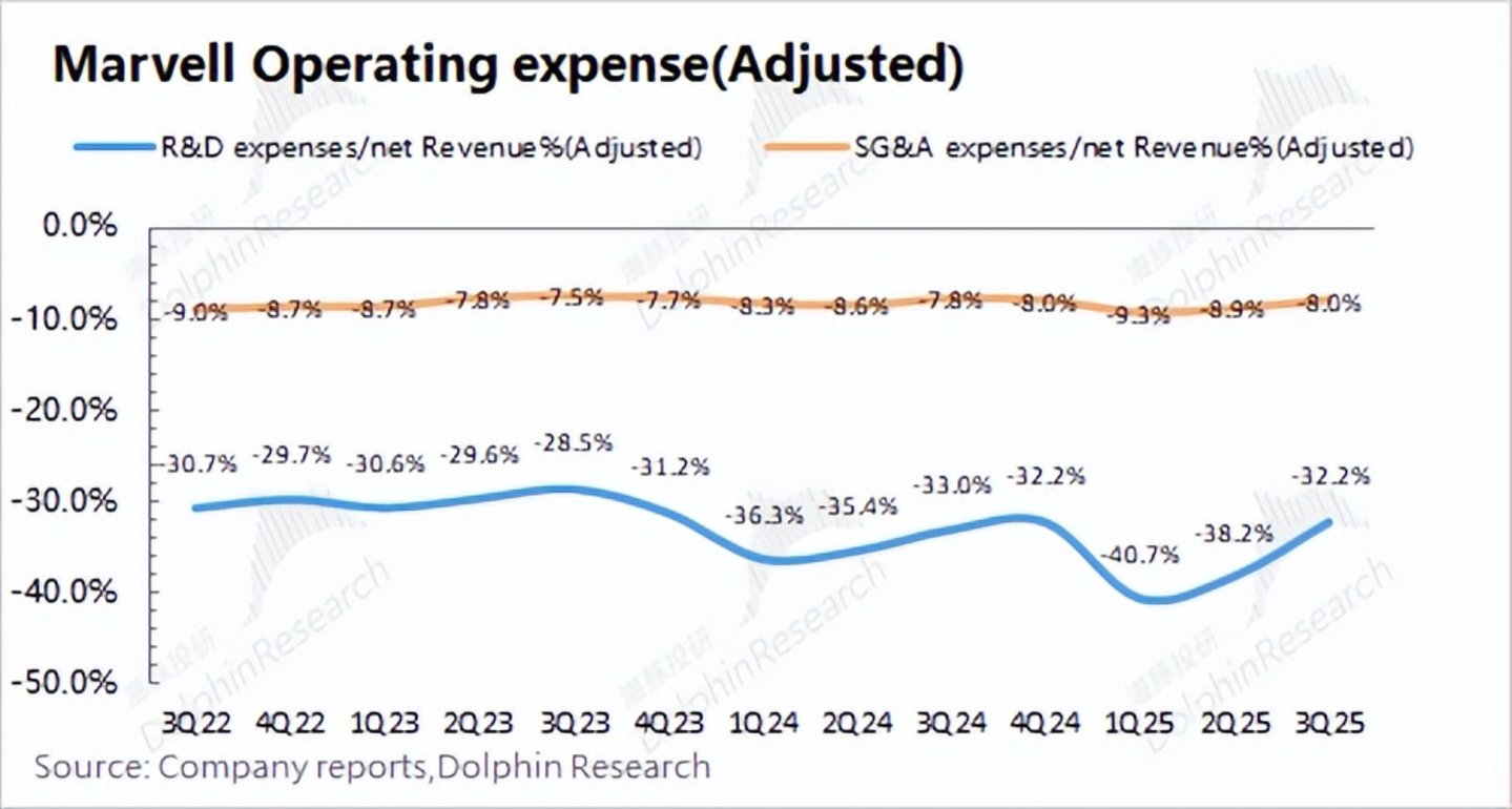 除了对收入端进行拆分预期以外,还需对公司的毛利率及经营费用进行预期,进而推测公司具体的业绩情况。在对Marvell的财报数据进行调整后,可以清晰地看到公司当前经营面毛利率及费用率的情况。