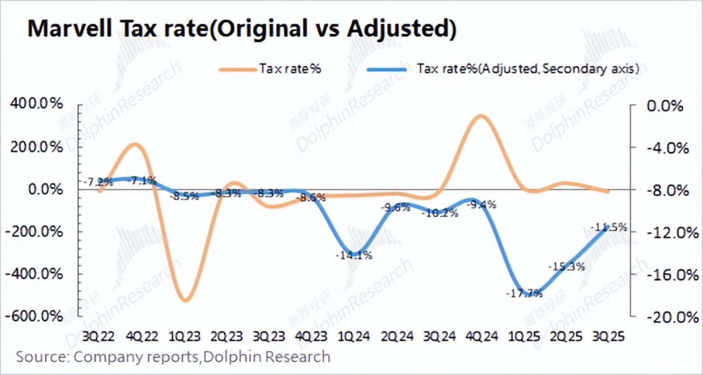Marvell经常调节公司所得税的财报数据,导致原始报表呈现出来的税率出现很大的波动。而通过使用调整后的所得税数据,可以看出公司当前的所得税率大多维持在10%左右的水平。