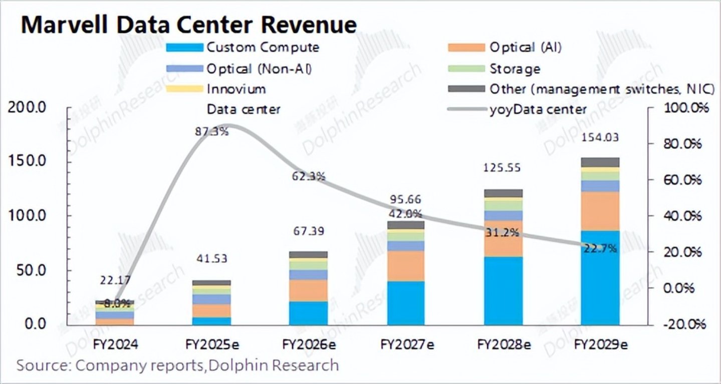 综合来看,在AISC及AI服务器的带动下,Marvell的数据中心业务至2028年(公司2029财年)有望增长至154亿美元,复合增速达到40%左右。