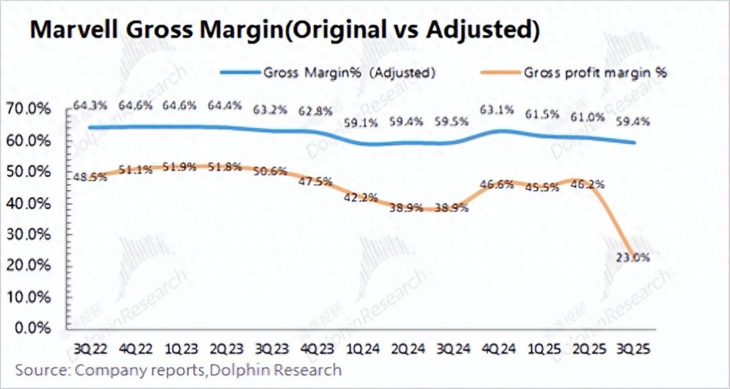 海豚君将公司财报数据调整后与原始的报表数据相比,两者有较为明显的差别。以Marvell的毛利率为例,公司调整后的毛利率稳定在60%附近,而原始报表中的毛利率是频繁变动的,将直接影响对公司的预期判断。