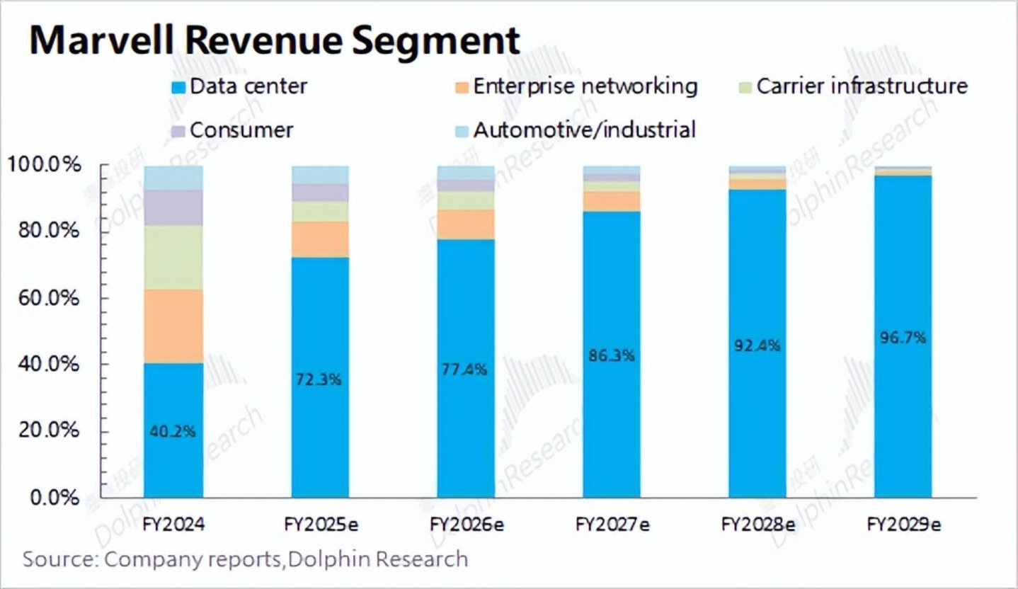 根据公司及行业面情况,海豚君预期Marvell的数据中心业务将增长至154亿美元,占比达到95%以上。而博通虽然数据中心相关的网络业务也是快速增长至500多亿美元,但公司其他业务仍有一定体量,公司网络业务占比将提升至8成。