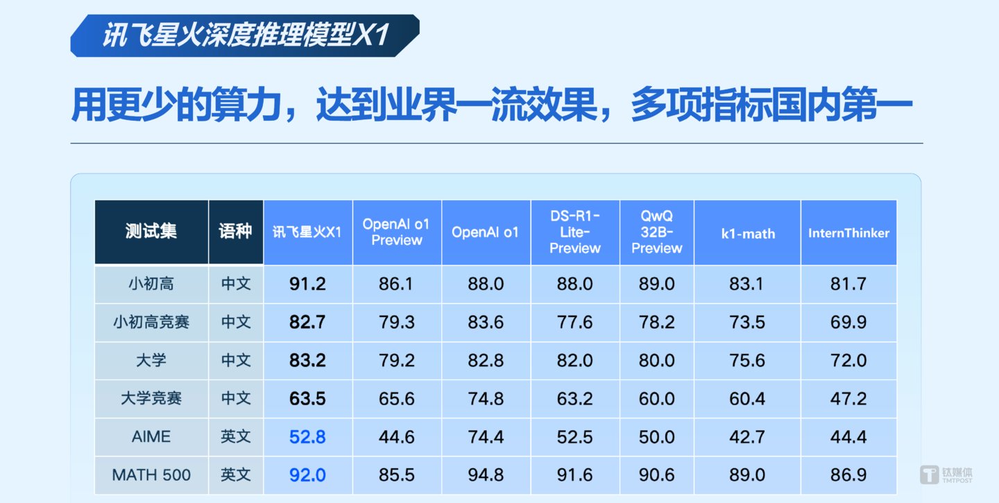钛媒体AGI获悉,1月15日上午,AI上市公司科大讯飞发布国产深度推理大模型“讯飞星火X1”,这是科大讯飞与华为联手训练出的中国首个基于全国产算力的具备深度思考和推理能力的大模型,对标OpenAI o1系列,中文数学能力国内第一,并率先应用于教育、医疗等刚需场景。同时,科大讯飞还公布讯飞星火4.0 Turbo升级版、国内首个具备端到端语音到语音同传能力的星火语音同传大模型。