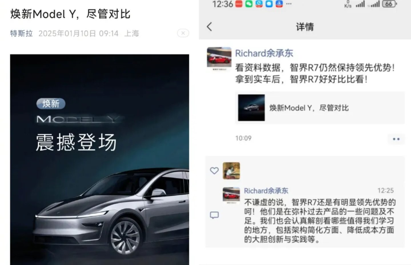 特斯拉官微发布“焕新Model Y,尽管对比”这条颇具求战意味的推送后,余承东旋即在朋友圈做出回应,自信表示从资料数据来看,智界R7在多方面依然保持领先优势,等拿到实车后,更要与之一较高下。