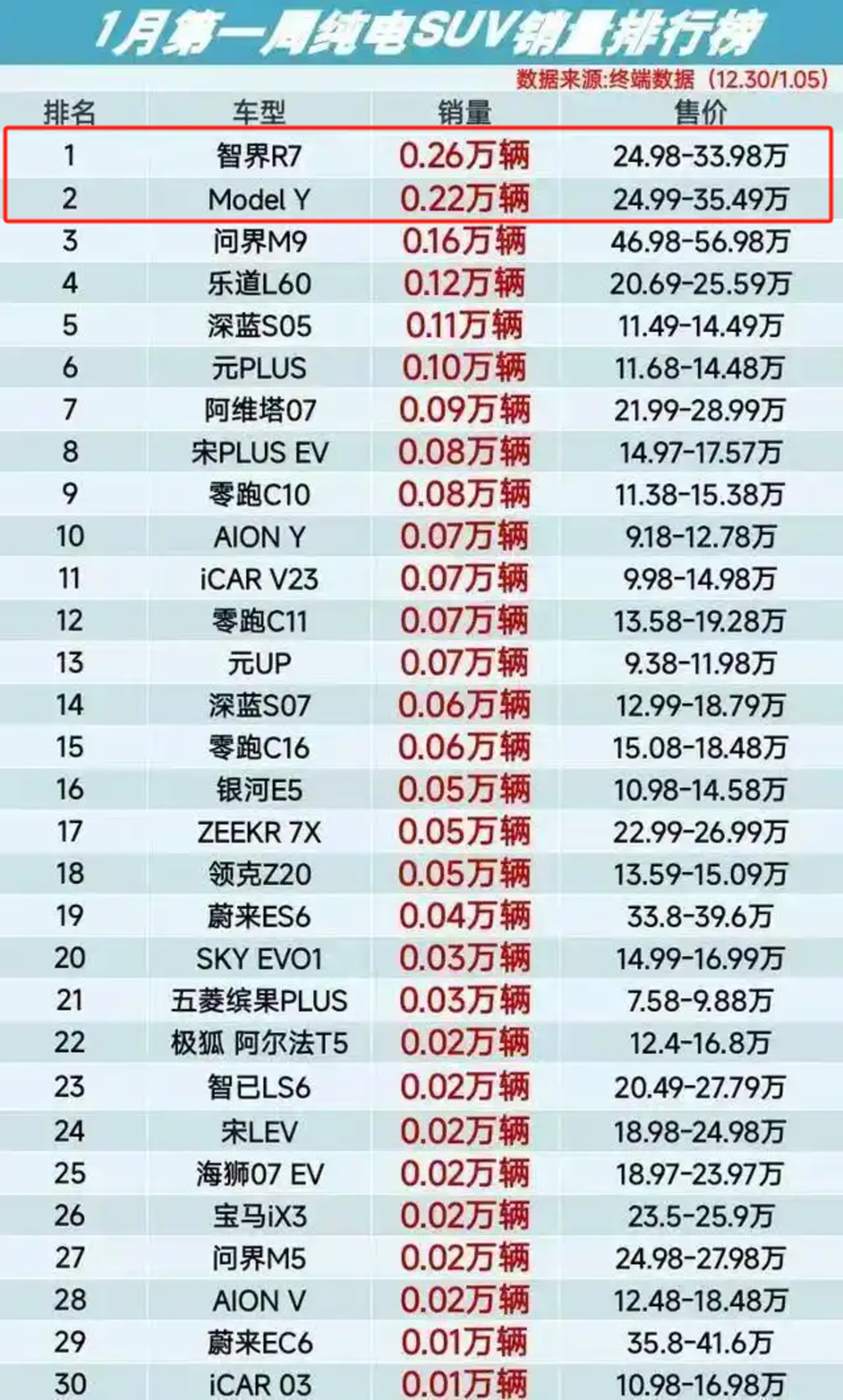 机构统计的2025年第一周纯电SUV销量数据日前公布,鸿蒙智行旗下智界R7以单周400辆的优势力压特斯拉Model Y,拿到开年第一周的销冠宝座。