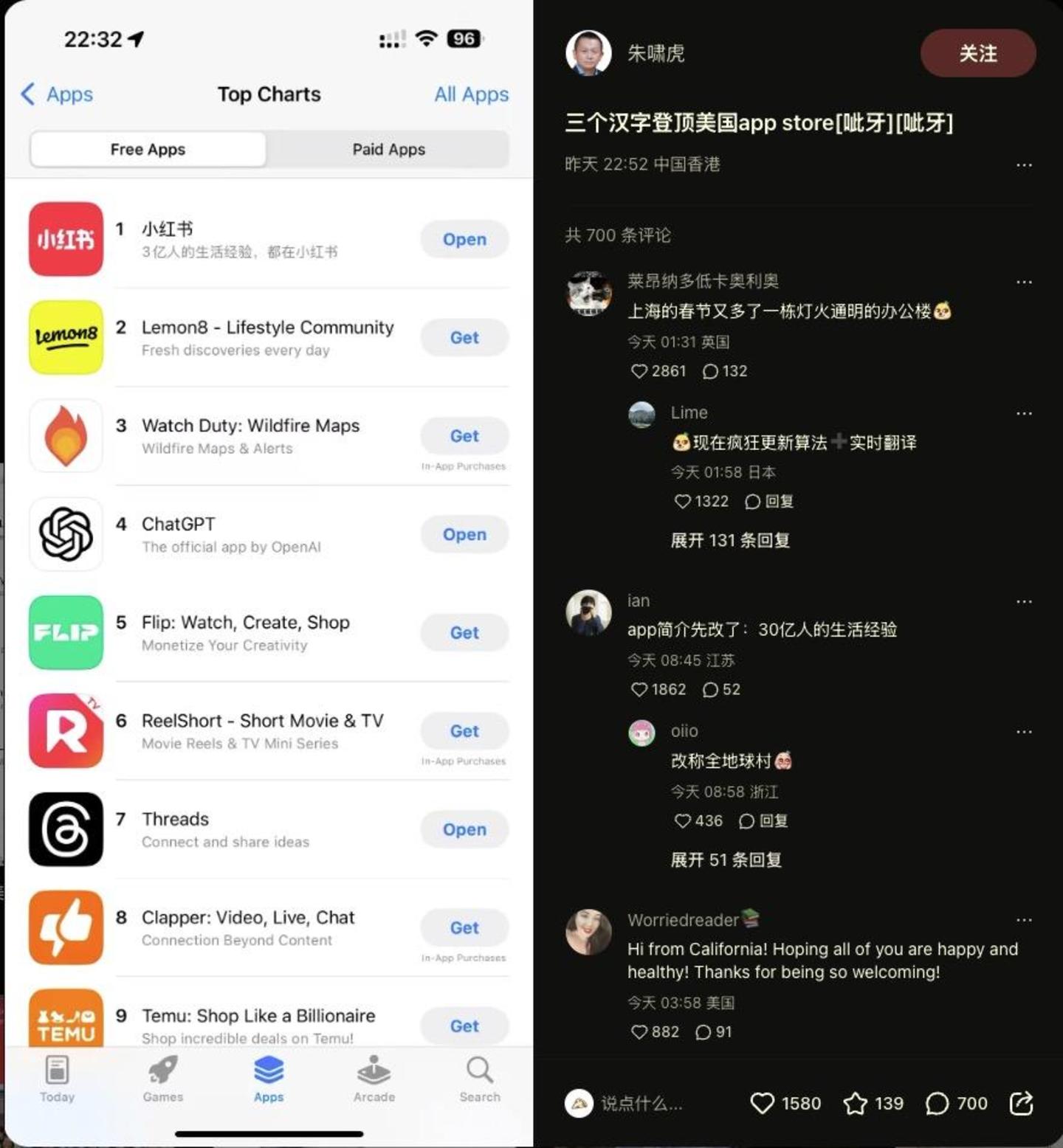 乐观者认为,这是一直追求国际化的小红书在国际化营销层面的成功。因为小红书是美国应用商店中为数不多的中国应用之一,小红书 App 登顶苹果美区应用商店免费榜,这使得小红书在美国市场的知名度和影响力迅速提升。