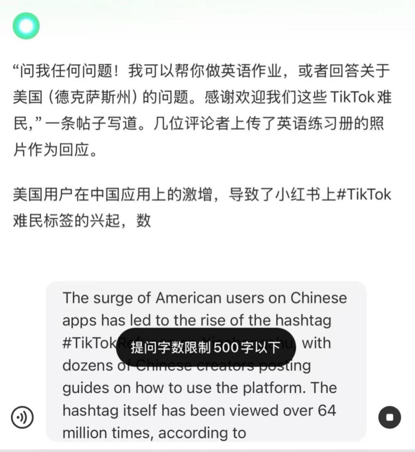 「点点」可以实现市面上大模型都能实现的实时文字翻译能力,但最明显的弱点在于文本数量,目前点点只支持简单提问,如果输入内容过长,则会提示「提问字数限制在 500 字以下」,也就是说,如果要实现长文本的翻译,「点点」并不能一次性满足,需要多轮对话,而同类型的豆包、Kimi 都早已经实现了长文本能力。