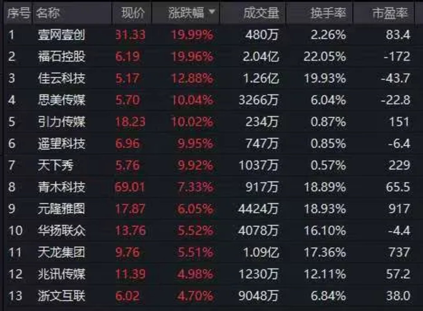 财联社1月14日电,受小红书国际版登顶美国苹果应用商店下载榜等利好消息刺激,小红书相关概念股掀起涨停潮。截至收盘,来伊份录得17天10板,利欧股份6天4板,元隆雅图和汇洲智能6天3板。此外,福石控股和壹网壹创20CM涨停,姚记科技、歌力思、天下秀、遥望科技、三维通信、华扬联众、爱慕股份、皮阿诺和引力传媒涨停。据不完全统计,包括兆讯传媒、嘉曼服饰、顶固集创、浪莎股份、金达威、北汽蓝谷、蓝帆医疗、中信出版、萤石网络、华升股份、全聚德、壹网壹创和佩蒂股份在内的13家上市公司本月在互动平台回应“小红书”相关业务情况。
