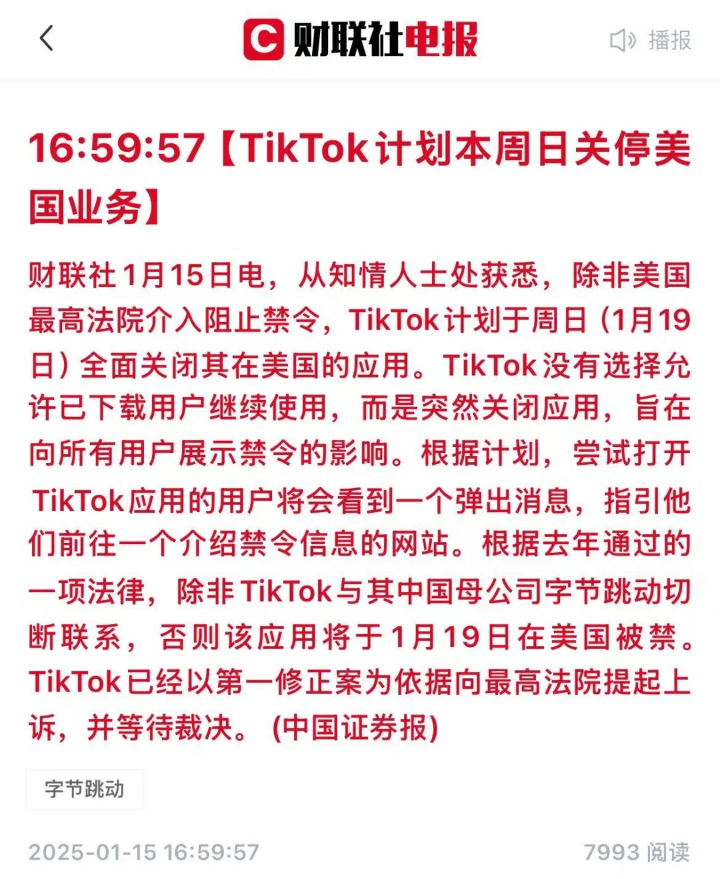 而今年1月19日,将是该法案的最后期限。这一天美国最高法院将会作出最后的判决。而在今天下午众多媒体传出的最新消息,除非美国最高法院介入,TikTok将在本周日全面关闭其在美国的应用。