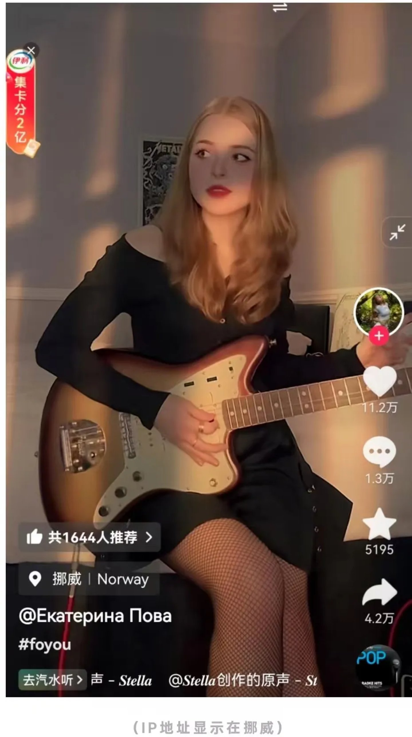 同样在抖音上,也涌入了大量所谓的“难民”。不少男网友发现,从1月14日白天开始,抖音上出现大量IP在境外的视频号,清一色的外国美女配合着目前抖音上流行的中文歌曲飘翩起舞。但根据笔者细心观察后发现,尽管出现“TikTok Refugee”的原因是源自于美国的一项禁令,但在抖音上刷到的IP地址绝不仅仅是美国,或者说美国反而不是一个很常见的IP,在上面能看到很多我们熟知的国家,甚至一些非常小众的国家也能刷到。