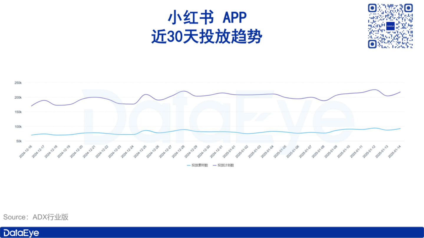 从时间维度上看,小红书投放力度呈现波动状态,观察期内,近7天(2025.1.8-2025.1.14)投放素材数较最初7天(2024.12.16-2024.12.22)有明显增长。