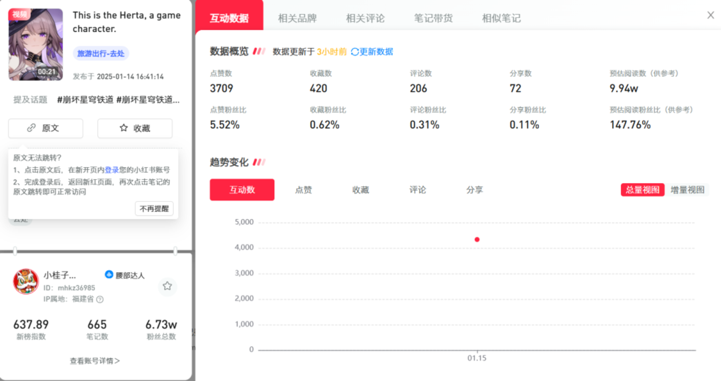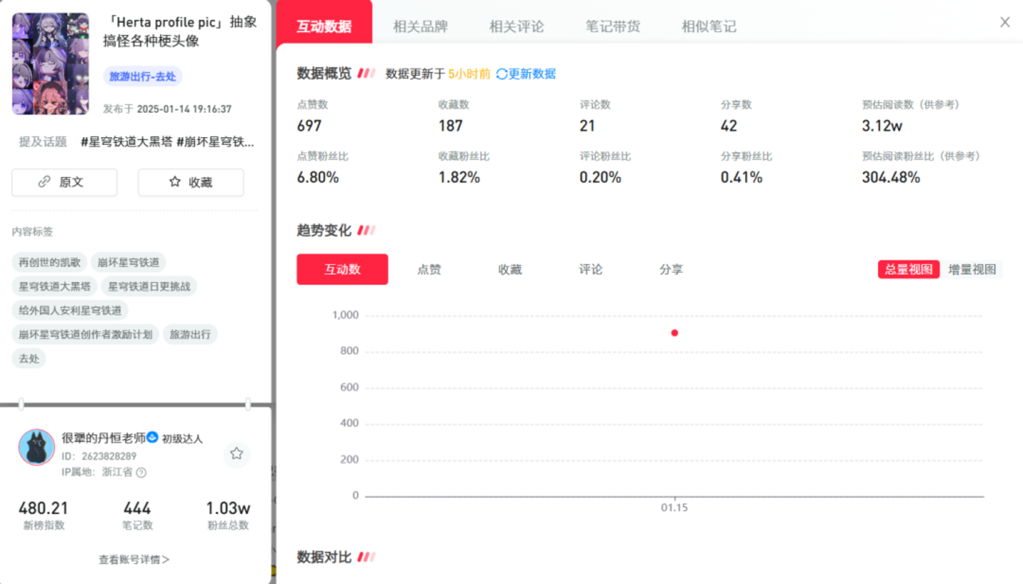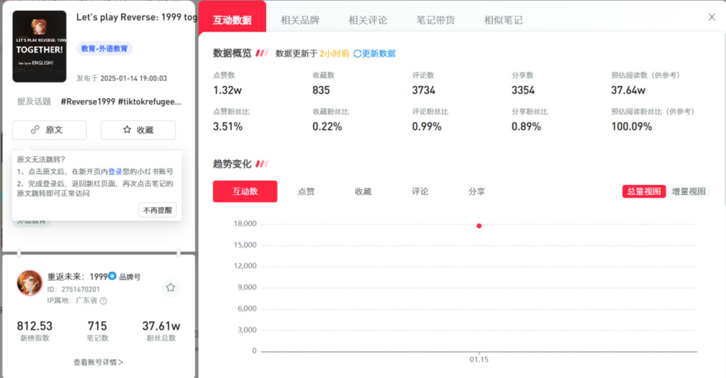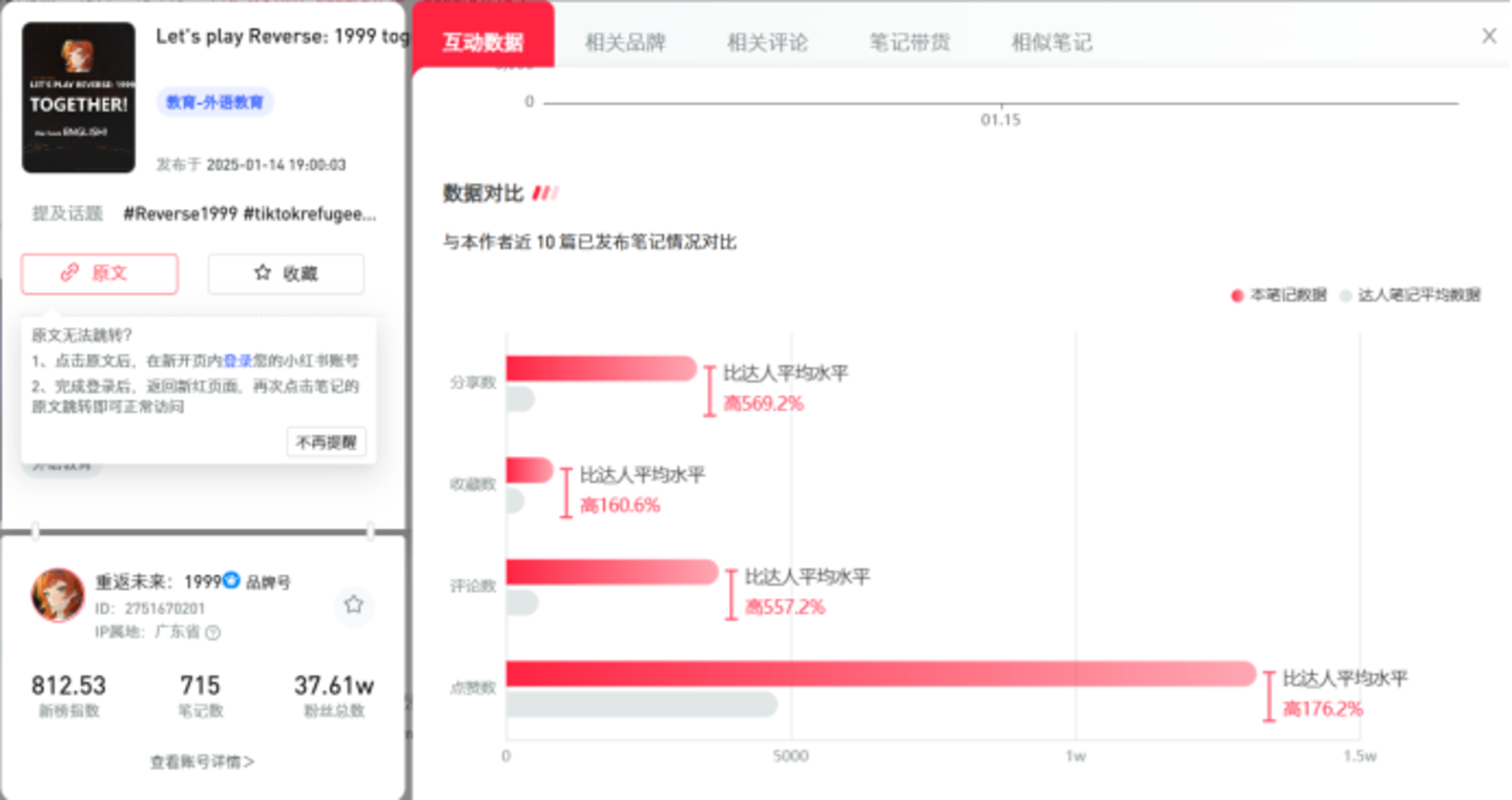 从相关笔记数据上来看,包括《重返未来:1999》等游戏官方也均吃到了这波流量,相关笔记数据远超平均水平。