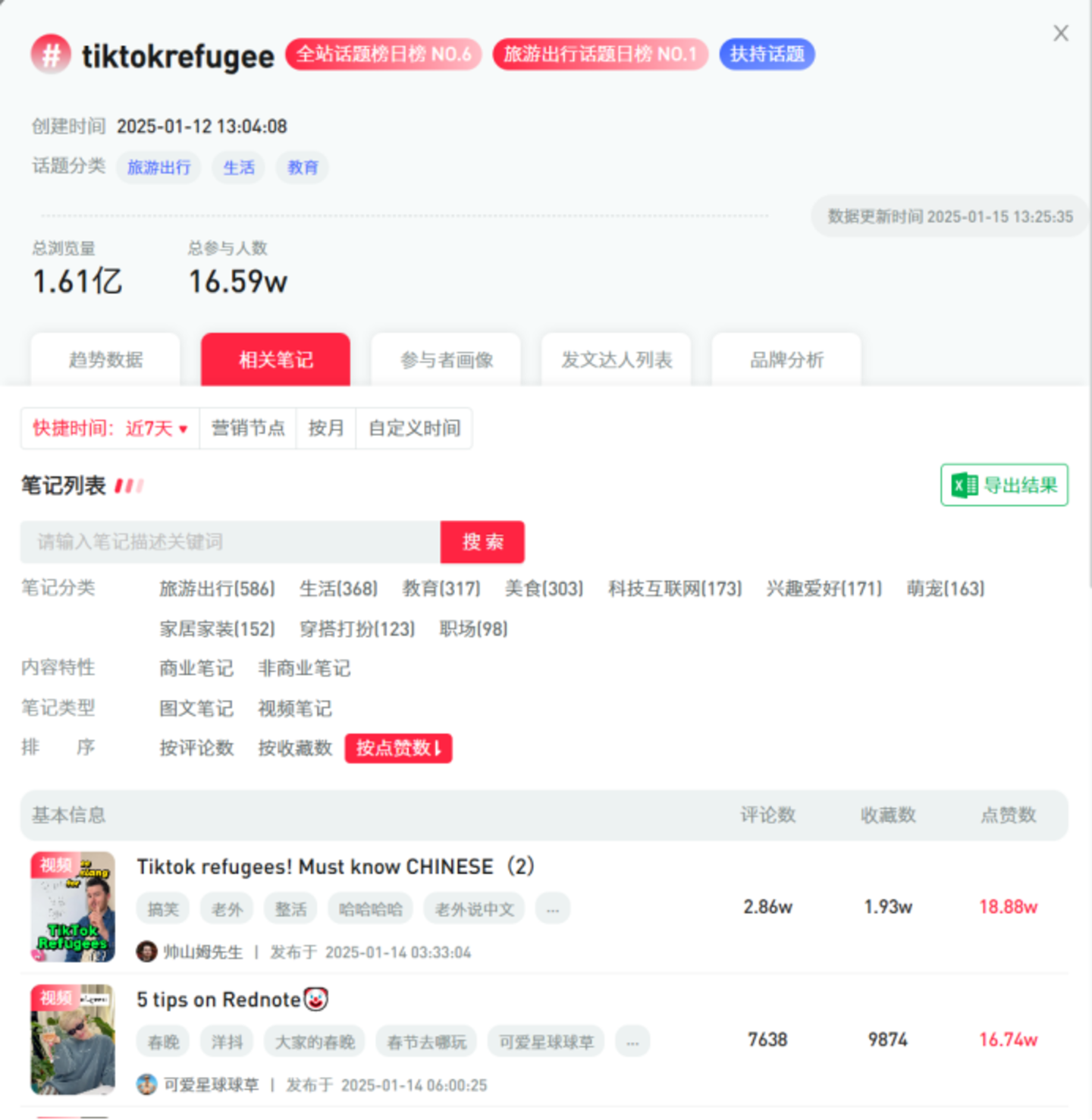 DataEye研究院观察到,截至2025年1月15日下午17点,小红书标签“#tiktokrefugee”下已有笔记33.9万篇,总浏览量4.0亿,总讨论量841.7万。